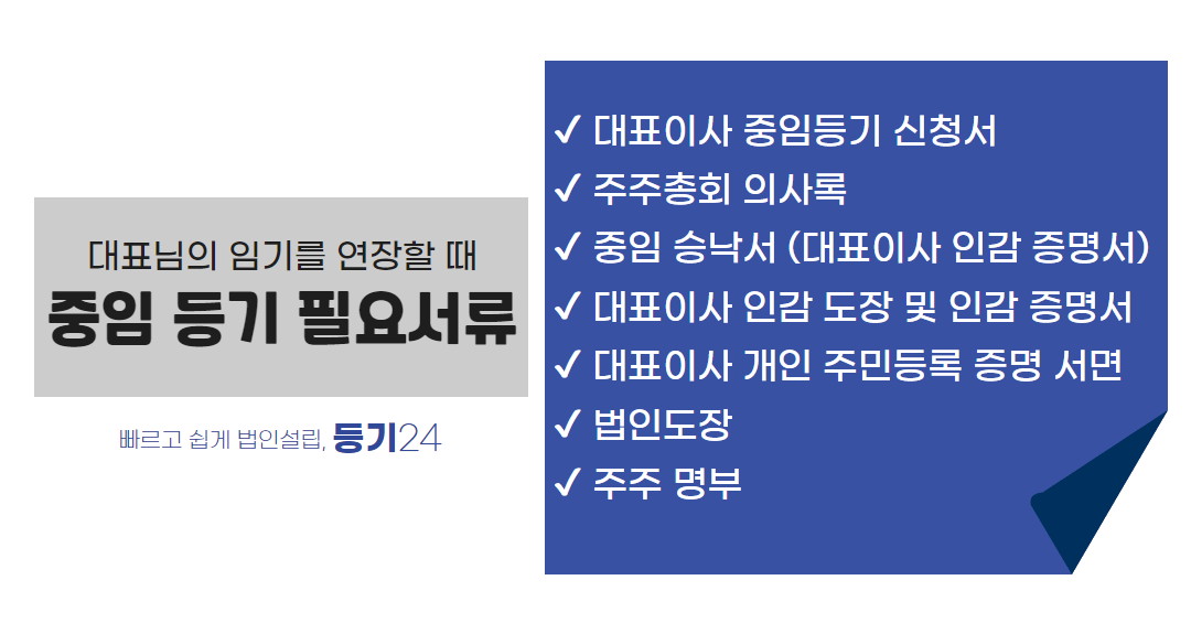 중임등기에 필요한 서류는 아래와 같습니다. 3년마다 필수로 해야하는 변경등기이기 때문에, 해당 서류를 미리 준비하는 것을 추천드립니다.