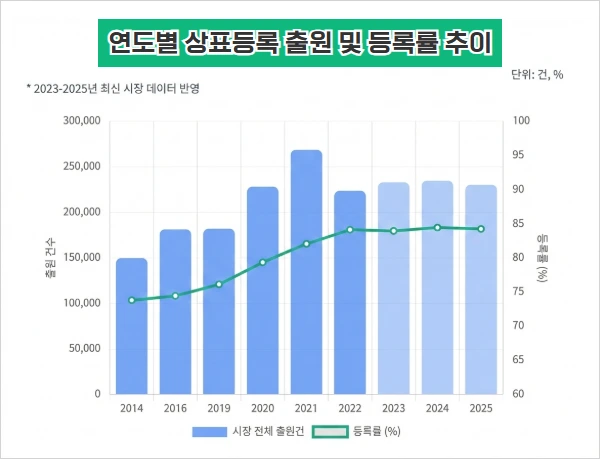 국내 상표등록 시장은 최근 3년간 연 23만 건 이상 출원이 꾸준히 이어지고 있습니다.