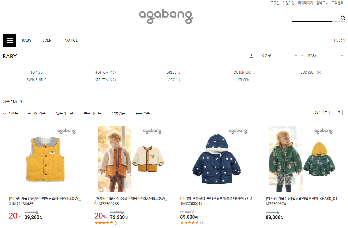 다양한 유아의류 제품들을 판매하는 아가방은