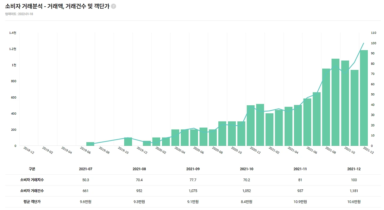 21년 12월에는 소비자 거래추이 100으로 최고점을 찍었으며, 이때 월 거래건수는 1,181건, 객단가는 10.6만원으로 추정됩니다.
