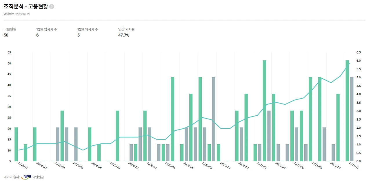 고용현황은 국민연금에서 제공받은 데이터로, 최대 3년 간 고용 현황을 보여줍니다. 마인드카페의 경우 고용인원이 꾸준히 증가하여 21년 12월 기준, 50명의 구성원이 함께하고 있음을 확인할 수 있습니다.