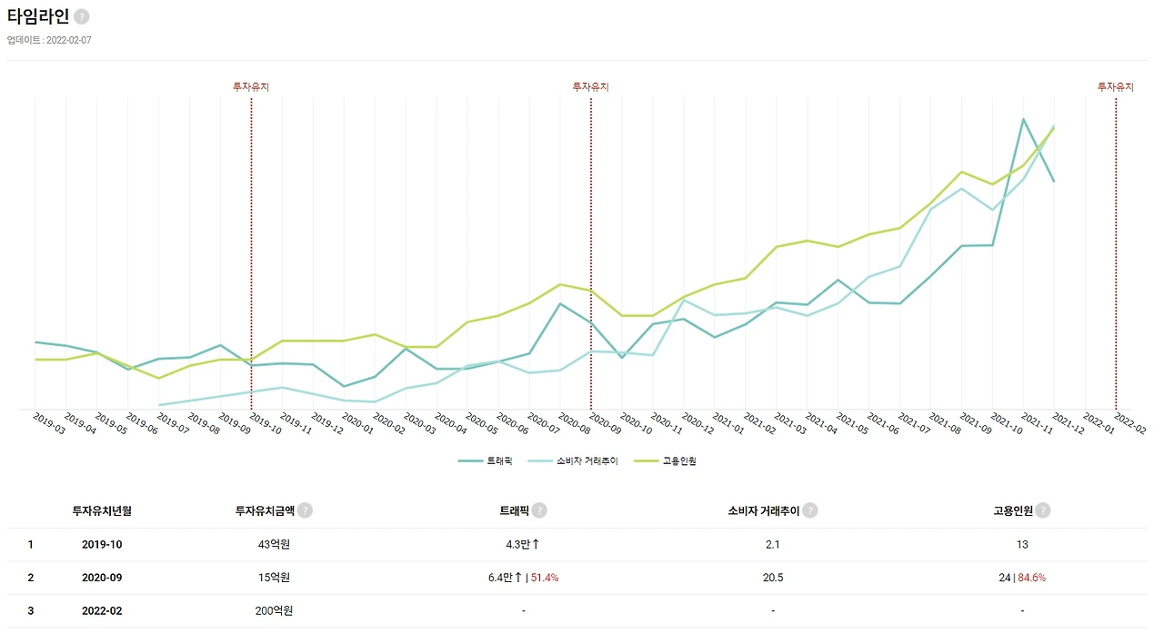 타임라인은 투자유치 시점을 기준으로 최대 3년간의 트래픽, 소비자 거래 추이, 고용인원의 증감을 보여주는 그래프인데요. 마인드카페의 타임라인을 살펴보면, 3개 지표 모두 전체적으로 우상향하고 있음을 확인할 수 있습니다.