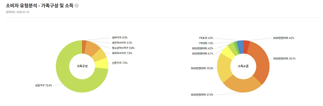 소비자 유형분석 데이터는 서비스 실제 유료 소비자의 성별 및 연령 비율, 가족구성 및 소득수준 비율을 보여주며, 해당 데이터 또한 국내 금융기관, 카드사로부터 제공받은 데이터를 분석한 값입니다. 마인드카페의 소비자 유형의 경우, 2030여성 고객의 비율이 무려 73.3%를, 싱글 가구가 73.4%를 차지하고 있습니다.