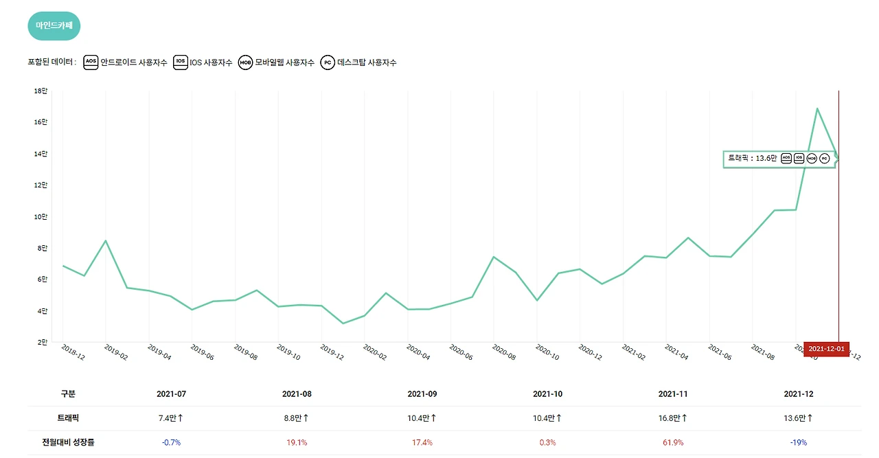 트래픽 데이터는 월간 활성 사용자 수(MAU)를 보여주는 그래프이며, 아래 표는 최근 6개월의 데이터와 전월 대비 성장률을 보여줍니다. 마인드카페의 21년 12월 MAU는 13.6만 이상으로, 전년대비(6.9만) 약 2배 증가한 수치이며, 트래픽 데이터 또한 지속적으로 우상향하고 있음을 직관적으로 알 수 있습니다.