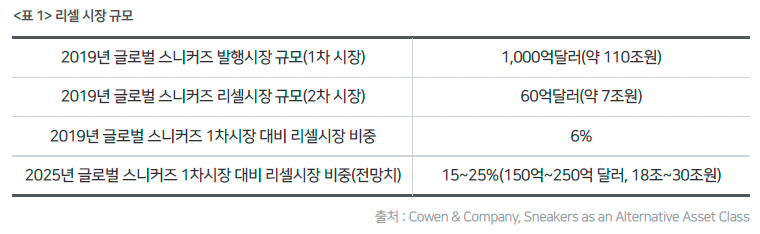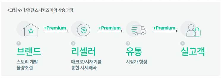 정리하자면 스니커즈를 발행하는 나이키를 비롯한 브랜드에서 추첨내지는 선착순판매 방식을 통해 유통물량을 조절함에 따라 가격에 1차 프리미엄이 붙고, 리셀업자와 일반 소비자를 포함하는 수많은 시장 참여자들이 향후 가격이 오를 것이라는 기대를 공유하게 되면서 강하게 2차 가격 프리미엄이 붙는다. 거래시장에 매물로 나와 시장가격이 형성되면 신발은 이제 더 이상 소비재가 아니라 환금성을 가진 투자상품으로 탈바꿈하게 되는 것이다.
