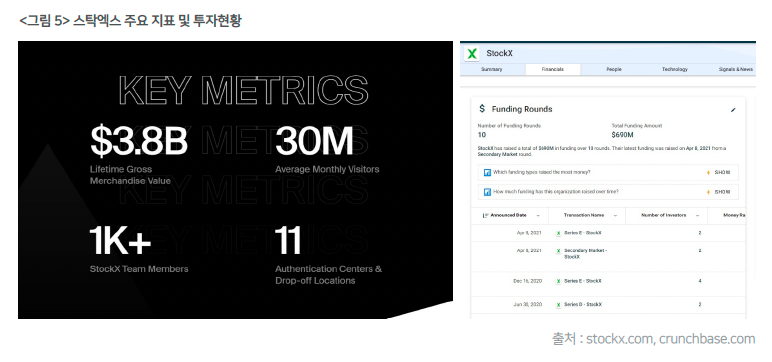 투자상품의 거래 수요가 많아지면 필연적으로 거래를 중개하는 플랫폼이 등장하게 된다. 과거에는 중고나라, 나이키매니아와 같은 커뮤니티를 중심으로 개인간 비공식 거래가 이루어졌었다. 거래플랫폼의 기능을 수행했던 각종 커뮤니티들은 가격 정보 비대칭성, 가품 유통의 위험, 거래사기 등 거래비용을 증가시키는 요인들이 다수 있었기 때문에 보다 투명한 거래 플랫폼이 요구되었다. 대표적으로 미국의 스탁엑스가 있다. 스탁엑스는 2016년 설립된 글로벌 리셀 거래 중개플랫폼으로 바이어 650만명, 셀러 100만명이 이용중이다. 2020년 거래액 2조 1,483억원을 기록하고 기업가치는 약 4조원을 인정받았으며 현재 시리즈E단계에 진입, 누적투자액 8,200억원을 기록 중이다.