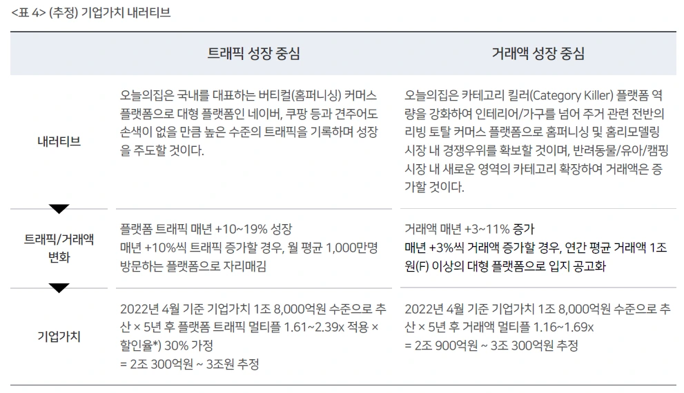 버킷플레이스의 기업가치는 2022년 4월 약 1조 8,000억원으로 매우 빠른 속도로 성장하고 있다. 2020년 11월 진행했던 시리즈C 투자 유치에선 약 8,000억원의 몸값을 인정받았다. 1년 반 사이에 덩치가 2배 넘게 커진 셈이다. 또한 보도자료에 따르면, 오늘의집의 연간 거래액은 1조 7,000억원 정도로 무신사(2조 3,000 억원), 컬리(2조 1,000억원)보다는 소폭 적은 상황이나, 벤처캐피털 업계에서는 무신사와 컬리의 기업가치는 각각 4조 8,000억원, 4조원 선에서 언급되고 있다. 아직 2조원을 밑도는 버킷플레이스의 기업가치는 오히려 상대적으로 매력적이라 여겨지는 이유가 될 수 있다. 한편 2020년 기준 버킷플레이스의 매출 규모는 759억원으로 무신사(3,320억원), 컬리(9,530억원) 대비 매우 적은 편이다. 비록 다른 업종이자 사업모델의 차이점이 있으나, 특정 아이템을 판매하는 버티컬 커머스 플랫폼으로 버킷플레이스의 매출 및 수익성 측면에 대한 관심은 투자유치 때마다 언급될 것으로 예상된다. 향후 트래픽 또는 거래액 중심으로 성장할 경우, 트래픽은 매년 최소 +10% 이상, 또는 거래액이 매년 최소 3% 이상 성장을 이루어 내야 5년 후 2조원 이상의 기업가치로 전망할 수 있다.