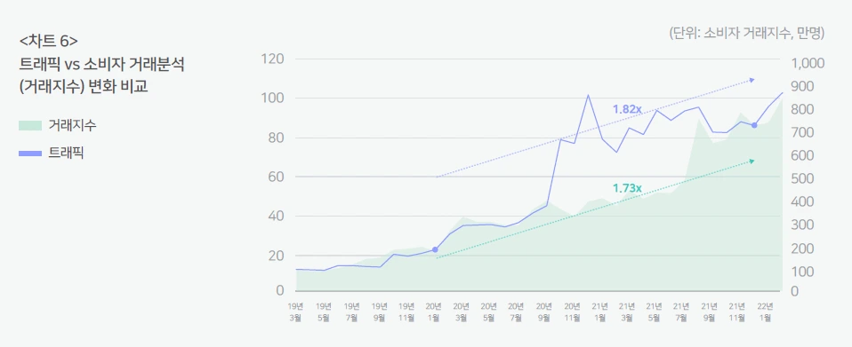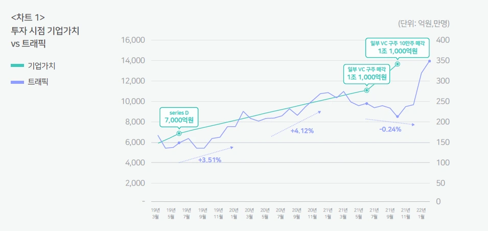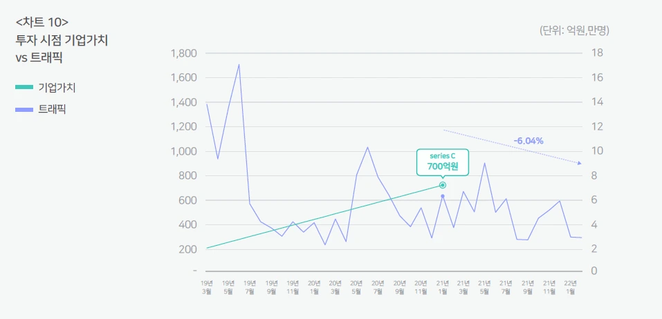 특히, 2021년 이전 트래픽 추이는 주택매매 거래 추이와 유사하게 트래픽 증감을 보이고 있었으나, 2022년부터는 주택매매 거래 추이 하락임에도 상당히 가파른 트래픽 성장을 보여주고 있으며, 이는 향후 투자 라운드의 기업가치 스토리에 긍정적 요인으로 부각될 것으로 보인다.