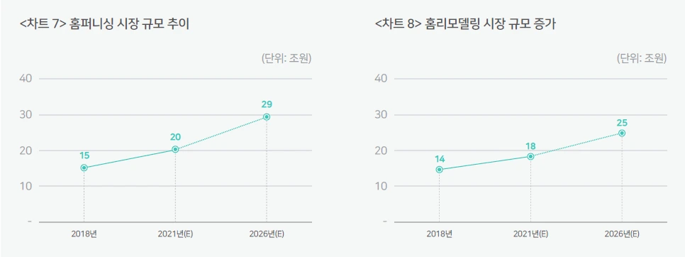 급속도로 팽창하는 국내 인테리어 시장에서 ‘현대백화점’은 글로벌 온라인 가구·매트리스 기업 ‘지누스(아마존 내 매트리스 판매 1위)’를 7,747억원에 인수하였고, 2012년 계열사인 현대그린푸드를 이용해 국내 가구전문 기업 리바트의 경영권을 확보, 2019년 현대L&C의 건자재 사업을 계열사로 편입하는 등 인테리어 분야에 확장을 거듭하고 있다. 신세계그룹은 2018년 가구 브랜드 ‘까사미아’를 약 1,800억원에 인수했다. 롯데그룹은 PE와 손잡고 2021년 가구·인테리어 업체 ‘한샘’을 공동인수하기도 했다. 건자재 전문기업인 ‘KCC’는 벽지업계 3위 업체인 신한벽지를 인수했다. 특히, 인테리어의 기본이라 할 수 있는 벽지 업체를 인수해 인테리어 시장에서 존재감을 높이고 있다. 가구·인테리어 기업의 연달아 인수한 배경은 인테리어 시장의 폭발적인 증가세 때문이다. <차트7> 업체 추정에 따르면 홈퍼니싱 시장 규모는 2026년 29조원까지 커질 전망이다. 또한 홈리모델링 시장 규모는 2026년 25조원까지 성장한다. 투자자인 VC업계에서는 해당 시장의 성장 가능성을 높이 평가하고, 향후 대기업에 지분을 매각하는 방식으로 투자금 회수(엑시트)도 용이하다고 판단할 것이다.