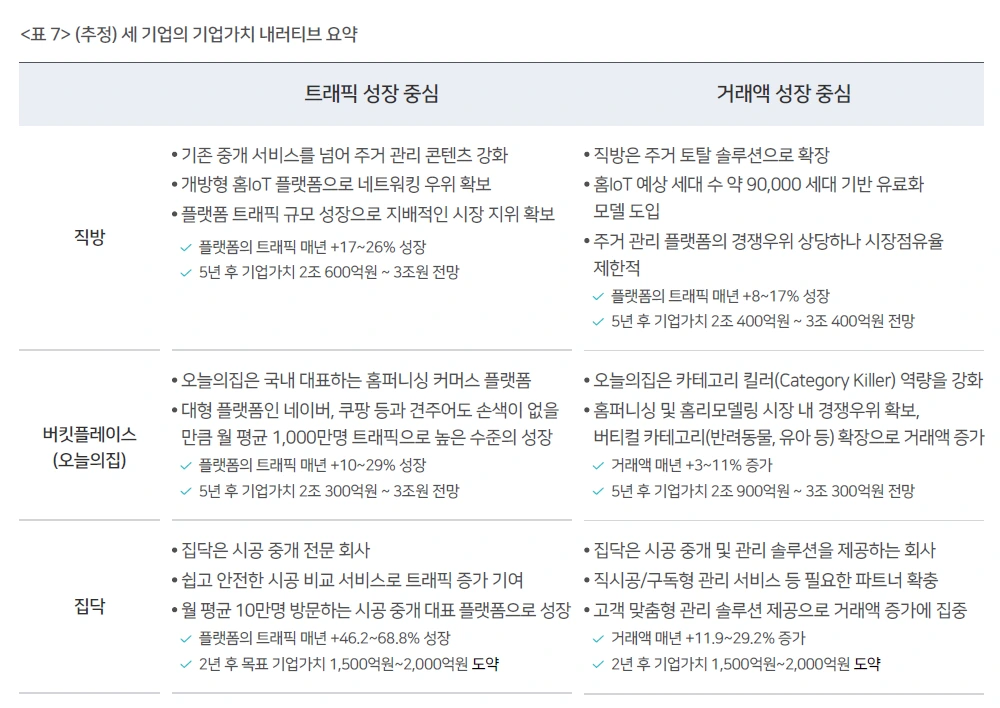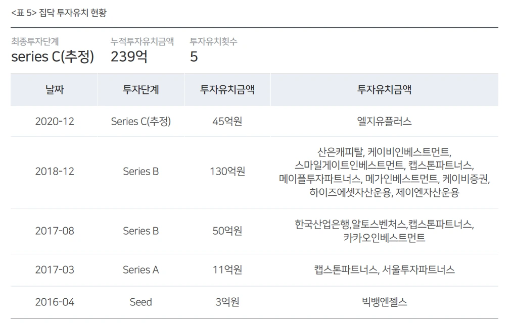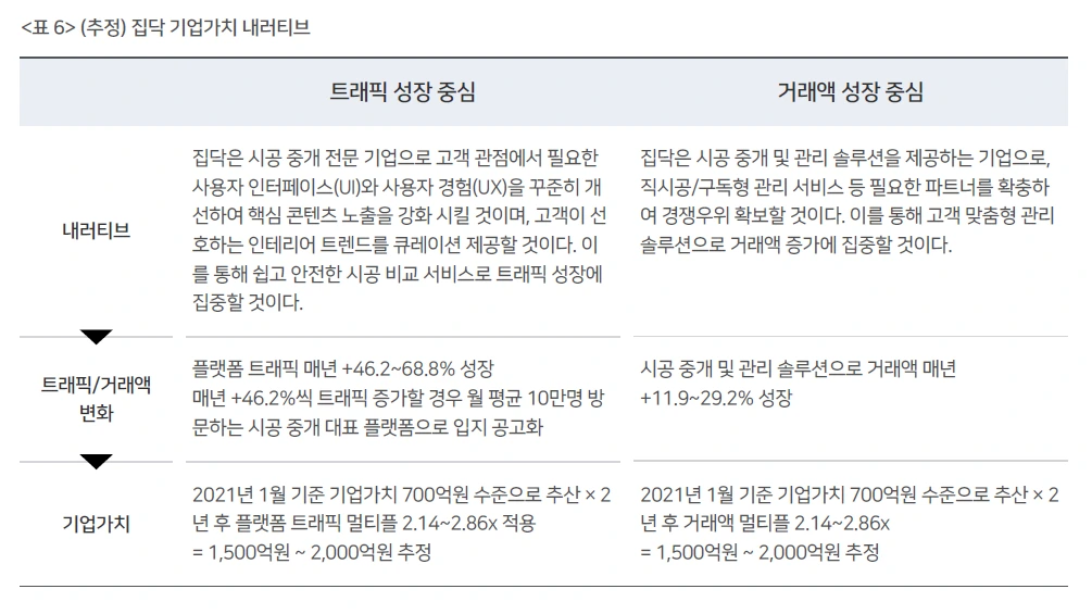 2021년 1월 기업가치 약 700억원으로 투자유치를 받았으며, 약 2년 이후 1,500억~2,000억원 기업가치를 목표한 것으로 예상된다. 2년 후 약 2배 이상 기업가치 성장을 이룰 수 있을지 관심이 주목된다. 반면 최근 트래픽 및 매출은 꾸준한 성장을 보여주고 있지는 못하고 있다. (집닥 매출 2018년 67억원 → 2019년 49억원