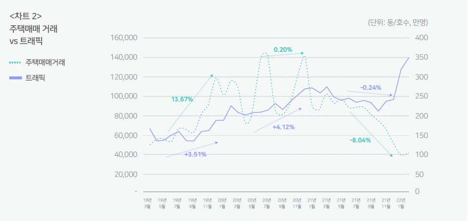<차트1> 2021년 내 구주 거래가 이루어진 하반기 시점 트래픽(-0.24% 감소)과 이전 년도 하반기 시점(19년 +3.51% 상승, 20년 +4.12% 상승) 대비 21년 하반기 트래픽의 성장률은 다소 저조한 상황이다. <차트2> 단, 2021년 하반기에는 국내 주택매매 거래 시장의 매우 저조한 상황(-8.04% 감소)을 고려한다면, 직방의 트래픽은 대외적 시장 감소 폭 대비 선전한 결과이다. 이는 부동산 시장의 정보 비대칭 해소에 대한 개선과 노력을 지속적으로 하고 있는 대표 플랫폼으로 자리매김하고 있다고 볼 수 있다.