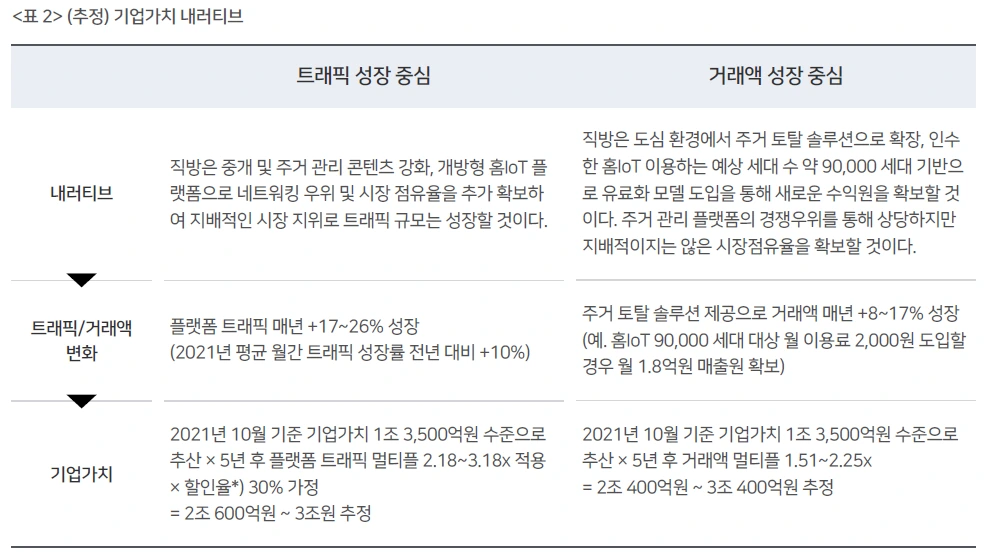 현재 직방의 자회사 및 투자처는 큐픽스, 로프트피엠씨, 호갱노노, 슈가힐, 셰어하우스, 브리즈인베스트먼트, 모빌 등이 있다. 올해 상반기 안에 삼성SDS 사물인터넷(IoT) 부문 인수를 완료할 계획이다. 홈IoT 기술력을 활용해 스마트홈 시장의 혁신을 일으키겠다는 청사진을 그리고 있다. 삼성SDS의 홈IoT는 스마트홈 시장 국내 1위로 해외 16개국으로 수출하는 글로벌 사업이다. 해외에서도 성과를 올리고 있는 만큼 이를 활용해 해외 홈IoT 시장에 진출하는 방안도 모색할 수 있다. 현재까지 디바이스 중심이었으나 직방의 주거관리 콘텐츠와 결합해 플랫폼 중심의 스마트홈 라이프로 시장을 혁신할 수 있을지는 기대해 볼만 하다. 향후 주거 중개부터 관리까지의 슈퍼앱으로 트래픽 또는 거래액 중심으로 성장할 경우, 트래픽은 매년 최소 +17% 이상, 또는 거래액이 매년 최소 8% 이상 성장을 이루어 내야 5년 후 2조원 이상의 기업가치를 증명할 수 있다. 한편 직방은 장기 목표로 기업공개(IPO)도 계획하고 있다. IPO 전 영업이익 턴어라운드라는 중요한 과제로 남아있다.