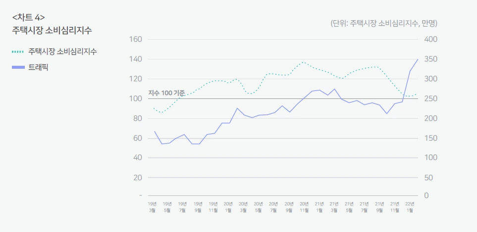 **부동산시장 소비심리지수는 0~200의 값으로 표현되며 지수가 100을 넘으면 전월에 비해 가격상승 및 거래증가 응답자가 많음을 의미