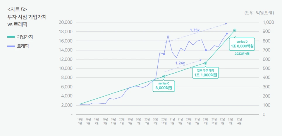 이를 최근 시리즈D 투자 유치를 통한 기업가치(1조 8,000억원)와 비교해 보면 향후 아시아 시장 진출, 버티컬 카테고리 다각화로 매출 증가, 높은 IPO 가능성 등이 긍정적인 요인으로 작용한 것으로 보인다.