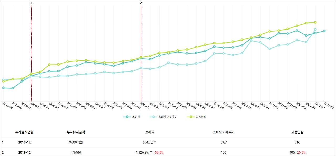 타임라인에서는 성장을 이끄는 핵심 항목인 1)트래픽, 2)소비자 거래 추이, 3)고용인원의 시간에 따른 변화와 투자 유치 시점, 투자 유치 시점의 세 가지 핵심 항목의 값을 종합적으로 보여줍니다. 세 가지 핵심 항목이 유사한 패턴으로 변화하는지 아니면 일부 항목이 다르게 변화하는지에 따라 성장 여부를 판단할 수 있고, 성장의 견실성을 파악할 수 있습니다.