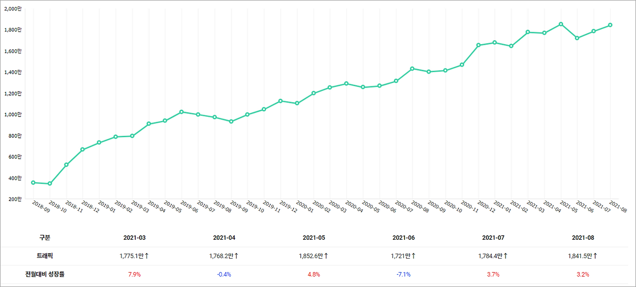 해당 서비스(웹/앱)의 최근 3년간 월간 활성 사용자 수(MAU)를 보여줍니다.