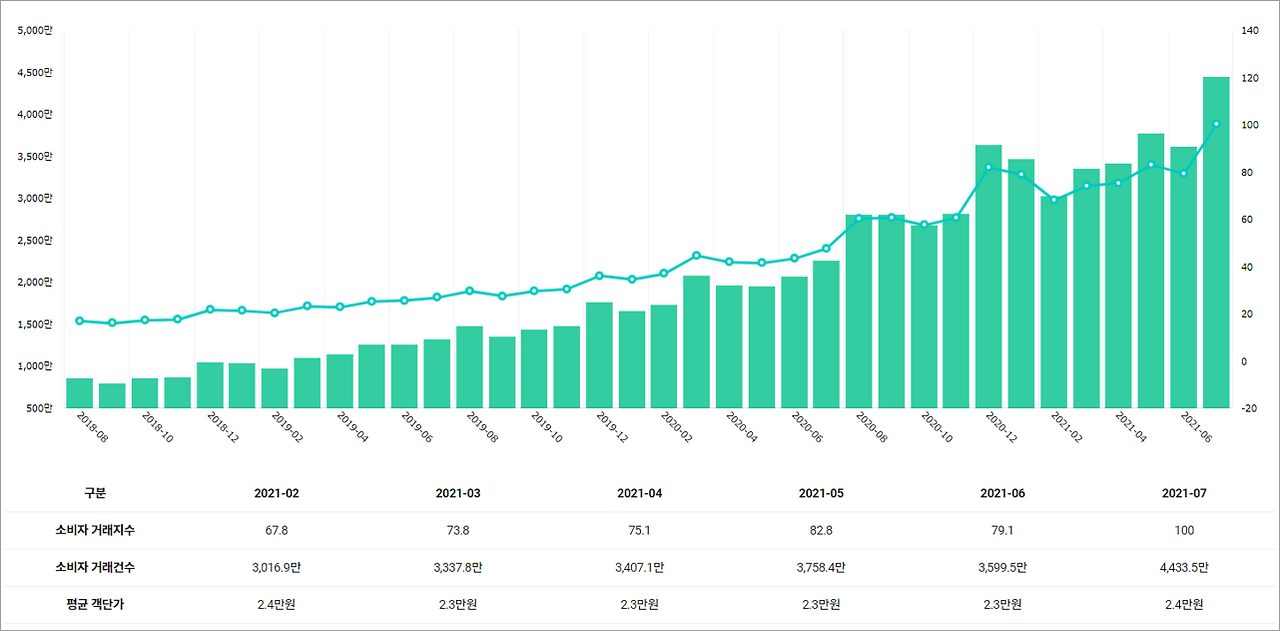 - 그래프의 왼쪽 축은 소비자 거래건수를, 오른쪽 축은 소비자 거래지수를 나타냅니다.