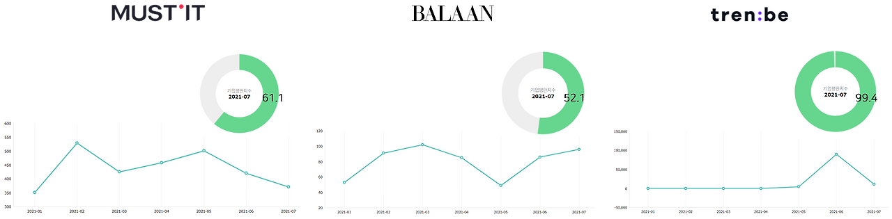 - 반면 '머스트잇'과 '발란'은 월간 버즈량이 평균 450회 이하이며, 버즈 SRS도 52%~61% 수준으로 '트렌비' 대비 저조함