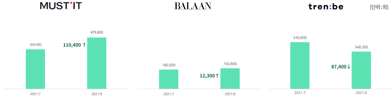 - 네이버 키워드 검색량(21년 8월 기준) : 머스트잇 479,800회, 발란 192,800회, 트렌비 348,200회