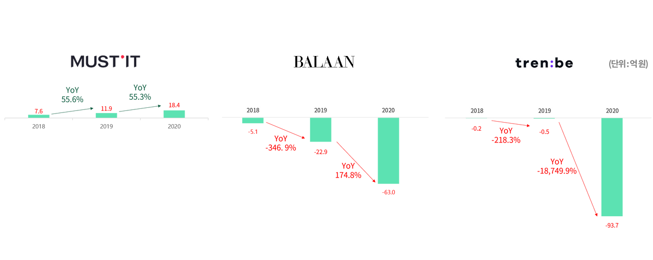 영업이익의 경우, 3개사 중 '머스트잇'만 유일하게 흑자를 기록