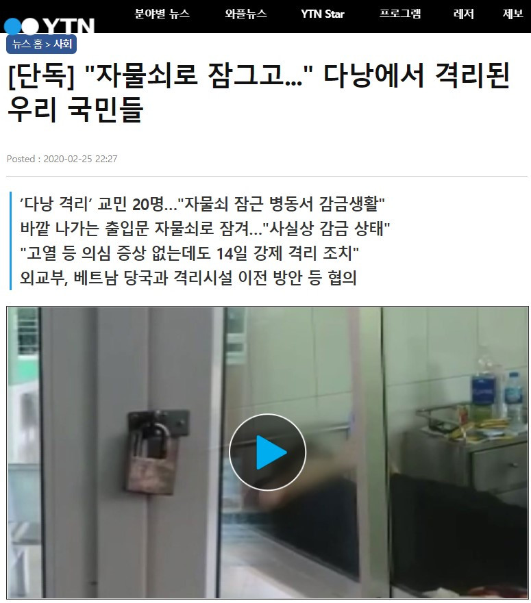 지난 2월 24일 대구공항에서 출발해 다낭공항에 도착한 한국인 관광객 및 교민 20명이 공항에서 현지 병원으로 즉시 격리 조치를 당하자 보도된 YTN 방송의 첫 코멘트이다. 격리된 한국 국민의 격앙된 목소리와 함께 자물쇠로 잠긴 병동을 비추는 영상은 명확하게 한국 국민이 부당한 대우를 받고 있음을 이야기하고 있었다. 최초 보도사인 YTN뿐만 아니라 많은 언론에서 아무런 증세가 없었음에도 대구에서 왔다는 이유만으로 일방적으로 한국인을 격리했다며 앞다투어 보도했으나, 해당 항공편에 동승한 베트남 승객 한 명이 발열 증상을 보여 탑승객 전원이 격리 조치된 것으로 확인됐다.