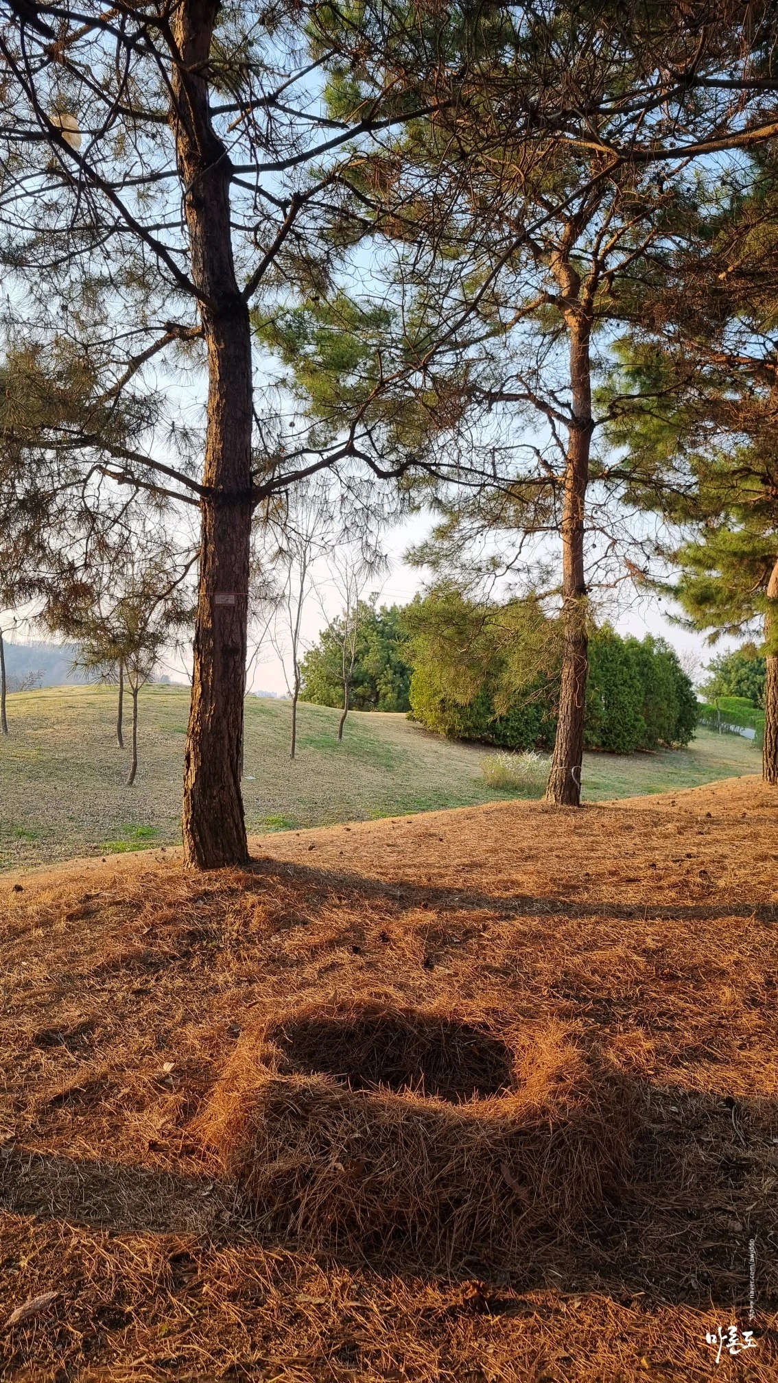 역시나 주말임에도 한적한 그곳. 평소 남편과 손잡고 걷던 잔디 위 연둣빛 산책로 옆으로는 옹기종기 모여있는 소나무들이 우리를 기다리기라도 한 것처럼 푹신하게 자리를 깔고 손님 맞을 준비를 하고 있었다.