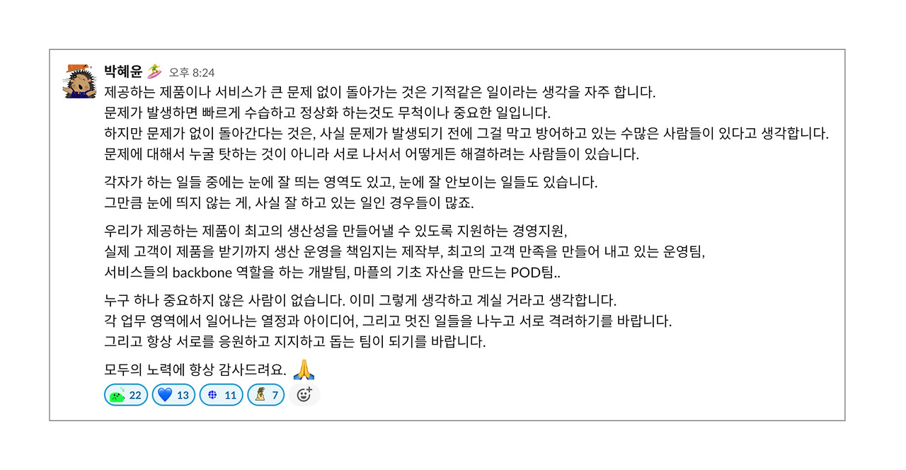 제가 커뮤니케이션 팀에 속해 있다 보니, 공지를 한다거나 다양한 의견들을 전사에 말씀드릴 기회가 많아요. 그러면 꼭 정성스럽게 의견을 남겨주시는 분들이 너무 감사하더라고요.