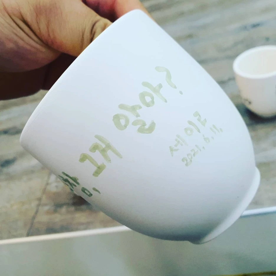 그렇다보니 자그마한 고사리같은 손으로 자기 얼굴만한 도자기 컵에 그림을 그리는 일이 어려울 수 밖에 없었습니다. 우리 반 어린이들만 해도 나눠준지 10초도 안되어 벌써 한명이 컵을 떨어뜨려 완전히 깨졌습니다. 다행인 건 아직 초벌구이 도자기라 날카롭거나 유리처럼 파편이 나지 않는다는 거였습니다. 부지런히 치우고 안전 조치를 하고선 새로운 도자기를 나줘주었습니다.