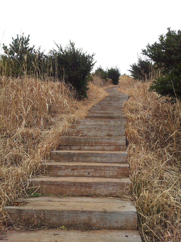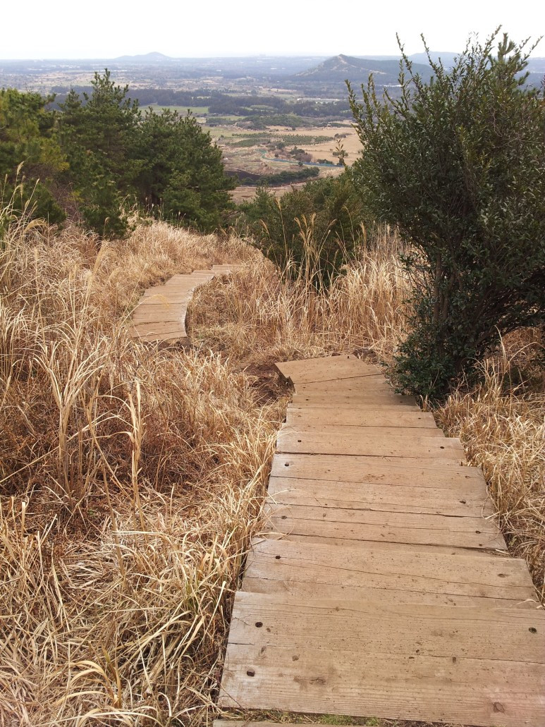 그래도 나섰으니 투덜대지 않고 올라보기로 합니다. 이 오름이 오르기에 가장 난도가 낮은 오름이라고 하니 그나마 좀 괜찮겠다 싶어 따라 오릅니다. 게다가 계단이 절반이라는 정보를 듣고 경사가 급한 건 아닌 모양이구나 하고 안심도 좀 했지요.
