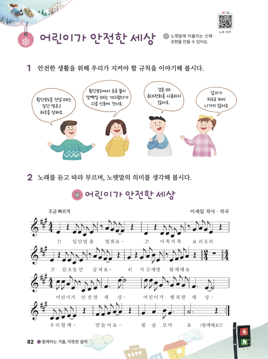 그리고 역시 올해부터 적용된 3~4학년군 2022 개정 초등학교 아침나라 4학년 음악 검정 교과서에 <어린이가 안전한 세상>이 수록 되었습니다. 이 곡도 원곡과 함께 소개해봅니다.
