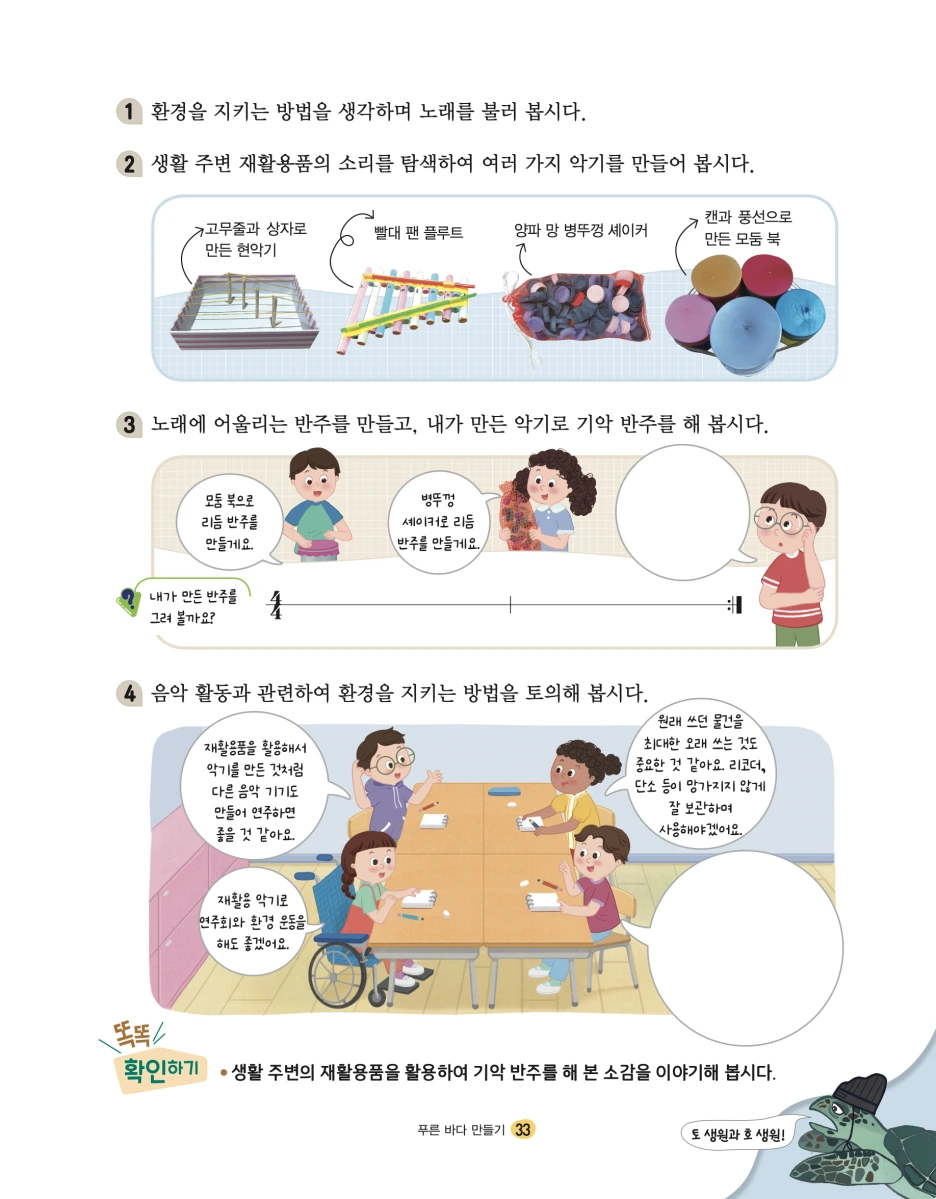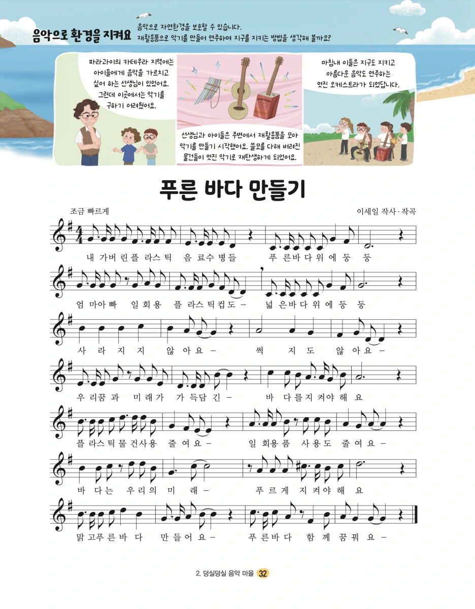 마지막으로 소개할 곡은 <푸른 바다 만들기>입니다. 환경에 대한 경각심과 실천 방법을 소개하는 노래인데 내년부터 적용될 5~6학년군 2022 개정 초등학교 음악과 생활 6학년 음악 검정 교과서에 수록되었습니다. 역시 원곡와 함께 소개해드립니다.