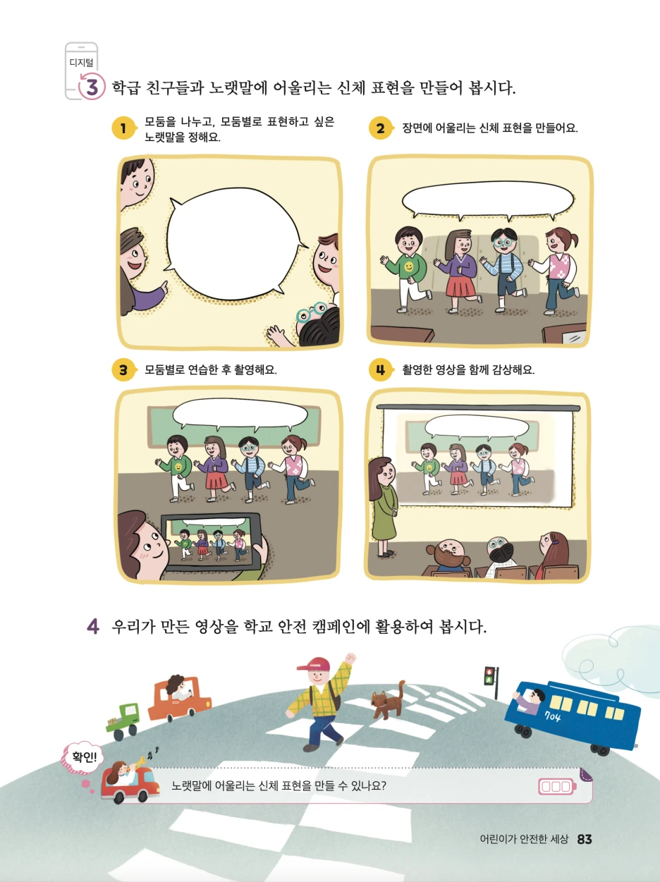 4년 전쯤, 우리 반에서 만들어 부르기 시작한 교통안전 캠페인송이 행정안전부의 캠페인송으로 불리우고 또 이렇게 개정 교육과정 교과서에 수록되어 기쁜 마음입니다.