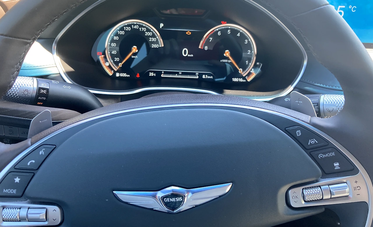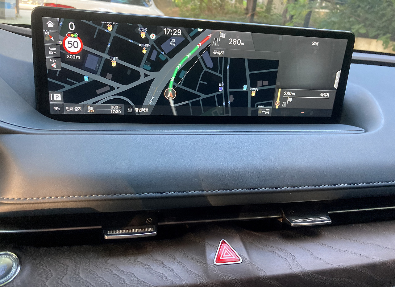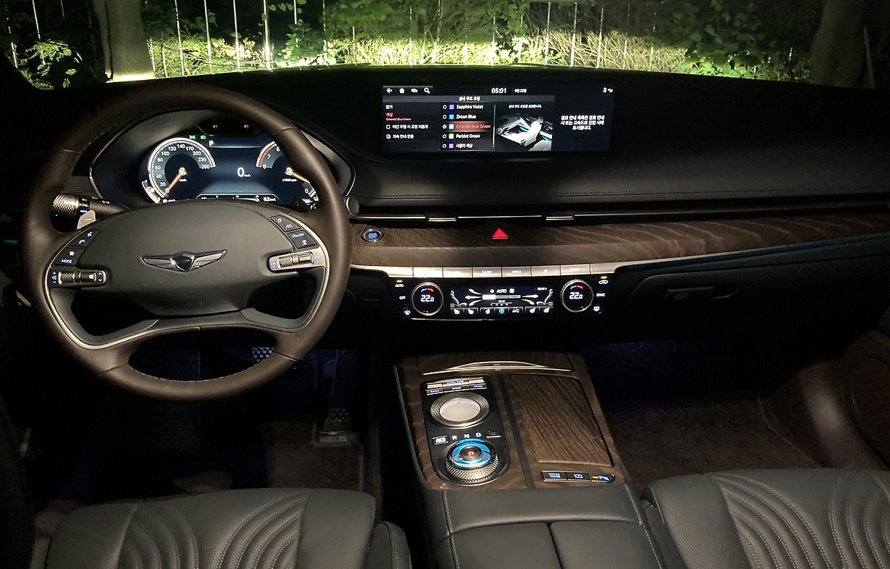 저는 외부보다 내부 디자인이 더욱 만족스러웠습니다. 실물로 보니 더 멋지다는 생각이 들었습니다. 12.3인치 클러스터의 그래픽은 시인성이 좋았고 인포테인먼트 시스템은 무려 14.5인치네요. 다만 길이도 길지만 높이가 낮아 더 길어보입니다. GV80에서 경험했던 다이얼 방식의 기어가 적용됐습니다. 크리스탈이 연상됐는데, 야간에보니 빛이 나네요. 그래서 한 컷 찍어봤습니다. 터치 타입의 공조패널도 보입니다.