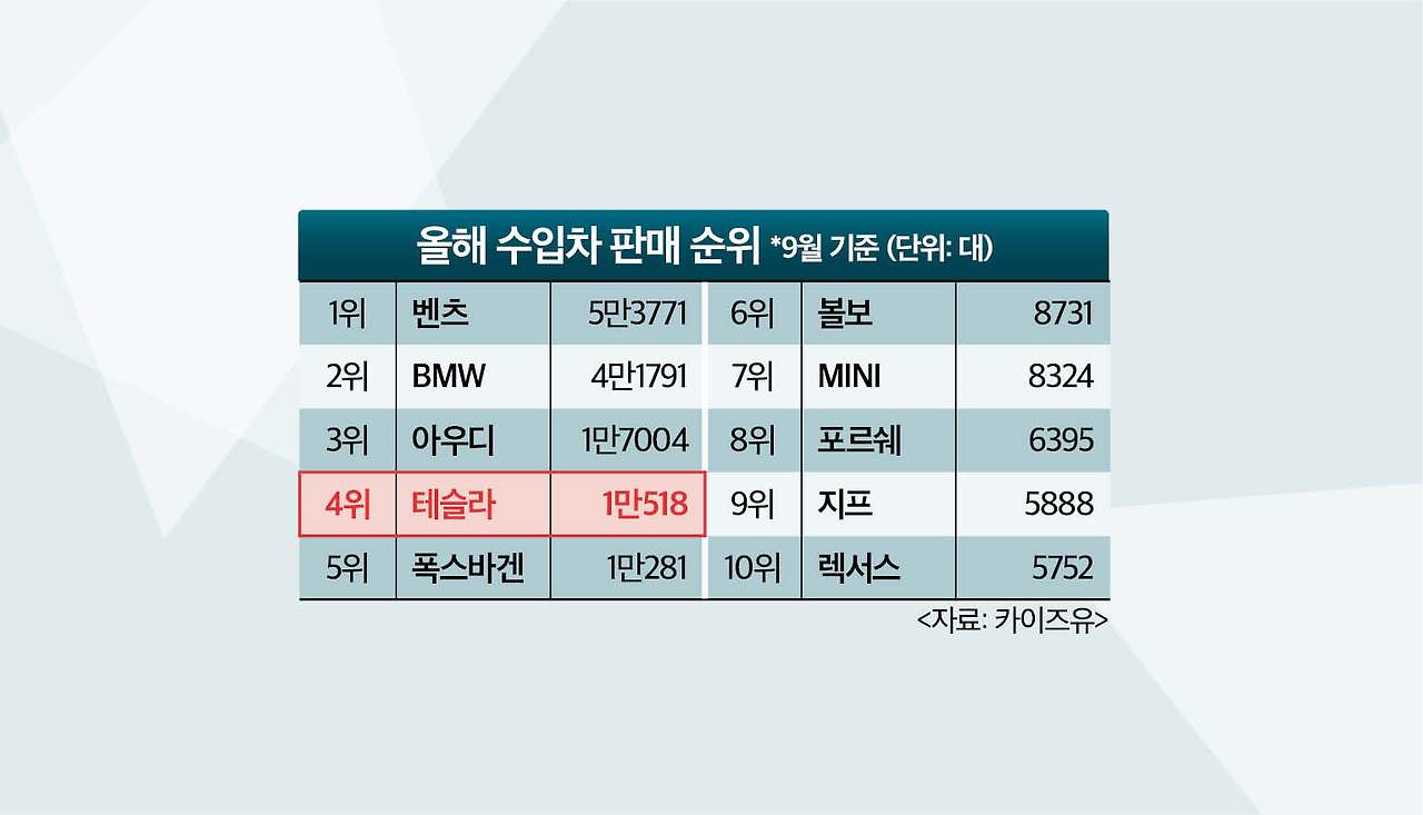 올해 수입차 순위에서도 모델3의 흥행에 힘입어 메르세데스-벤츠(5만3771대), BMW(4만1791대), 아우디(1만7004대)에 이어 4위를 기록했습니다. 폭스바겐(1만281대), 볼보 (8731대), 미니(8324대)보다도 높습니다.