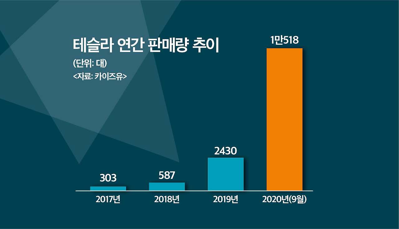 과거 테슬라가 넘치는 수요에 비해 생산이 따라가지 못하는 이른바 생산 지옥에 빠졌을 때 의구심을 갖는 시선이 많았습니다. (저도 그랬죠.) 다만 보급형인 모델3가 등장하고 실적으로 증명하면서 테슬라에 대한 부정적인 시선은 많이 사라졌습니다. 국내에서도 테슬라의 상승세가 돋보입니다. 2017년 303대에서 2018년 587대, 2019년 2430대, 올해는 9월까지 1만518대가 판매됐습니다.