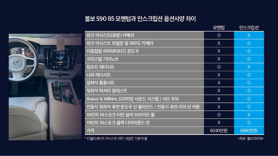 모멘텀과 인스크립션 가격 차이는 660만원인데, 생각보다 옵션 차이가 급니다. 일단 Bower & Wilkins 사운드 시스템, 앞좌석 통풍시트, 크리스털 기어노브, 나파 레더시트 등이 이 정도 가치를 한다고 봐서 제가 구입한다면 무조건 인스크립션 입니다.