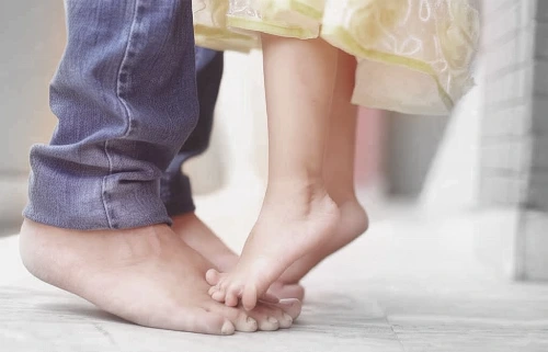 키 작고 나이 어린 큰 딸이 아빠의 양 발등에 올라타고 아빠의 허리를 감싸 안고...
