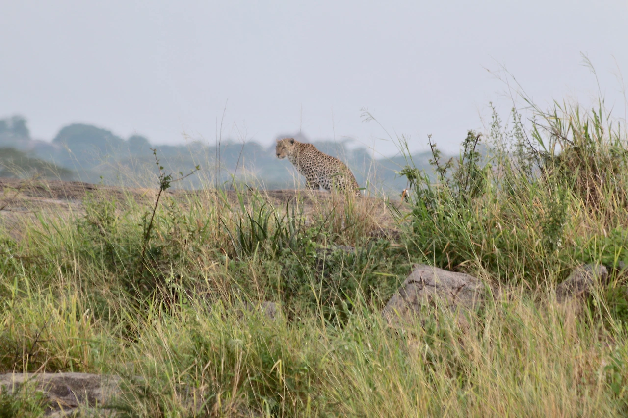 세렝게티 공원 입구를 들어서니 입구 초원에도 나무가 전혀 없다. 동물도 들소만 보인다. 드넓은 초원은 지평선 밖에 없다. 지평선 두 군데에서 비가 오는 것이 보인다. 좀 더 공원 안으로 들어가니 바위 위에 사자 다섯 마리가 있다. 그중 한 마리는 주변을 둘러보고 있고 나머지 네 마리는 바닥에 엎드려 자고 있다. 주변을 둘러보는 사자는 사냥할 동물들의 동태를 살피는 것이다. 멀리서 내리던 비가 우리가 있는 쪽으로 몰려온다. 한쪽은 비가 쏟아지고 한쪽은 무지개가 뜨고 또 다른 쪽은 햇빛이 비친다. 이것이 드넓은 초원의 날씨다. 비가 많이 와서 드라이브를 마무리하고 캠프로 들어오는데 100m 정도 떨어진 바위 위에 레오파드가 있다. 사진을 찍기에는 너무 멀지만 그래도 표범 모습이 담긴 사진을 찍을 수 있었다. 잠시 머무는 사이 주변에 드라이브 차량들이 몰려들었다. 잠깐 바위 위에 머물던 표범이 일어나더니 슬그머니 덤불 사이로 사라져 버린다. 좋은 표범 사진을 한 장 찍고 싶었는데 아쉽다. 그래도 빅 5중에 마지막까지 안보이던 표범을 봤으니 운이 좋은 셈이다. 표범이나 치타처럼 고양잇과 동물들은 나무 위에 주로 머물기 때문에 나무가 우거지는 우기에는 보기 어렵다. 레오파드를 마지막으로 오늘 드라이브는 끝났다. 공원 내 캠프에 오니 텐트를 미리 설치해 놓았다. 초베처럼 숲 속에 우리 텐트만 달랑있고 화장실과 샤워실도 없는 외딴 숲 속이 아니다. 여느 캠프처럼 전기도 들어오고 샤워장도 있는 곳이다. 멀찌감치 있는 샤워장에서 샤워를 하고 일찍 텐트로 들어갔다.