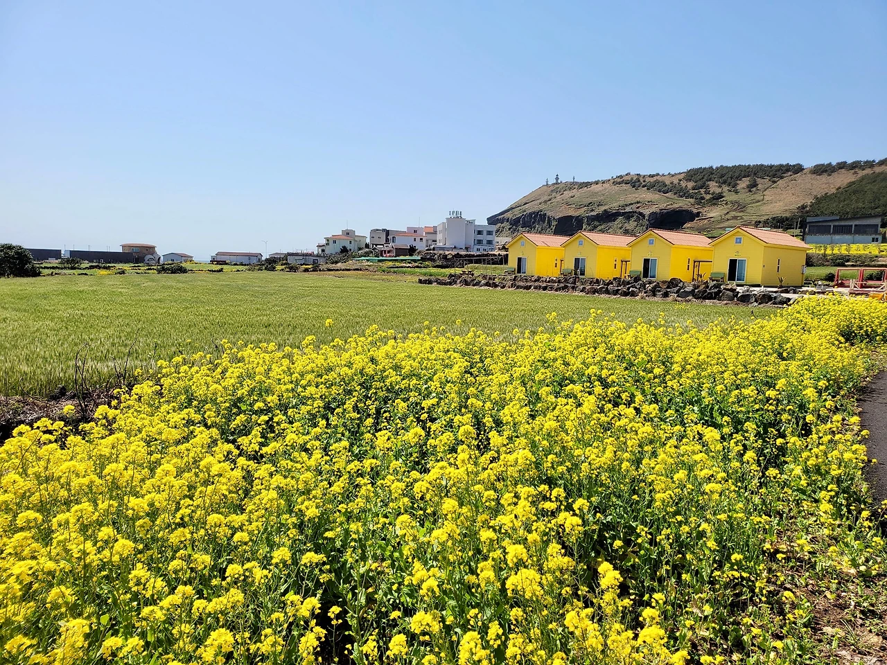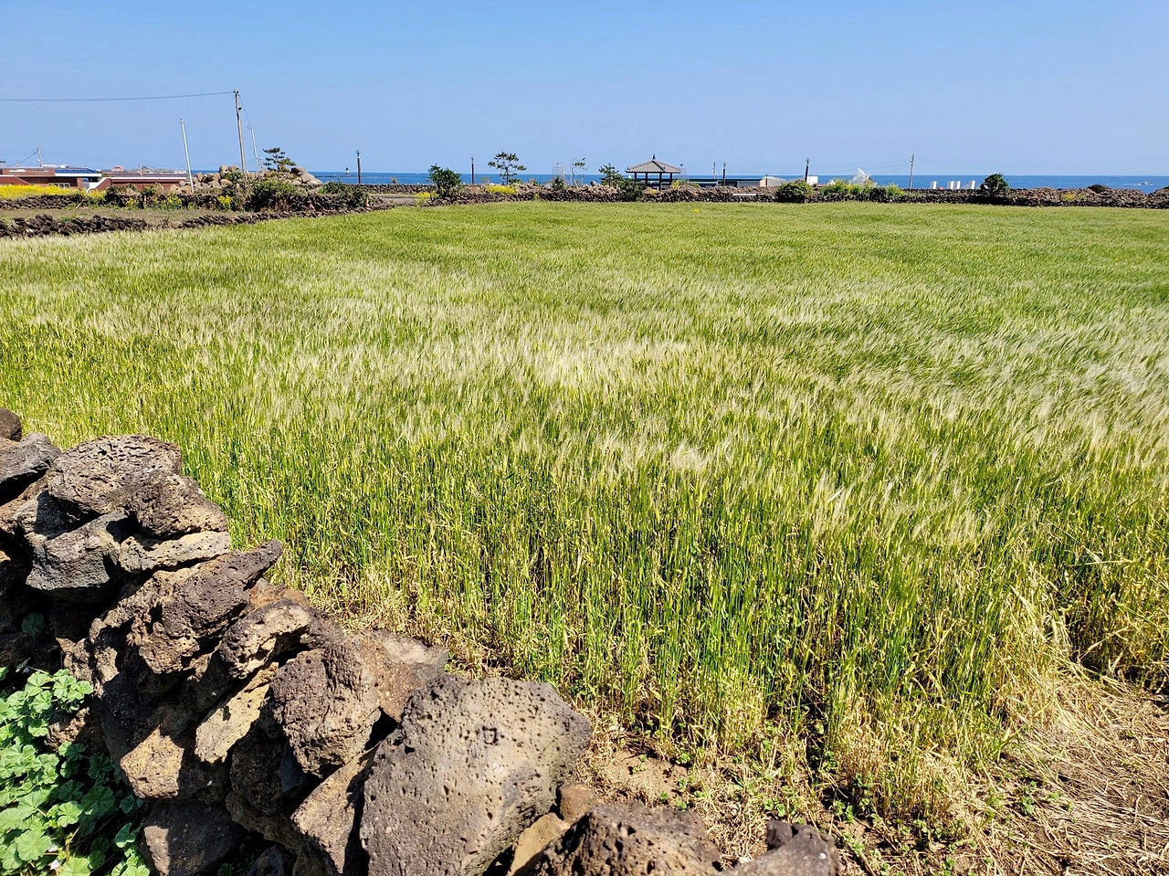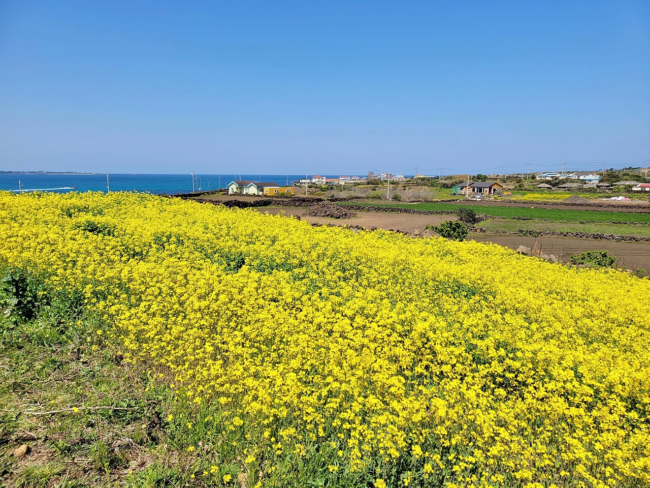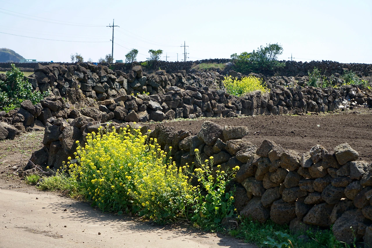 해변에서 올레길을 땨라 섬 안쪽으로 들어서면 봄보리가 돌담으로 둘러싸인 밭을 파랗게 물들이고 간간이 빈터에는 유채꽃이 흐드러지게 피어 있다. 눈을 들어 먼 곳으로 시선을 보내면 파란 수평선의 바다가 있고 지척인 눈 앞에는 봄보리의 푸르름과 유채의 샛노랑이 검은 바위 담장에 둘러 싸여 눈을 현란하게 한다.