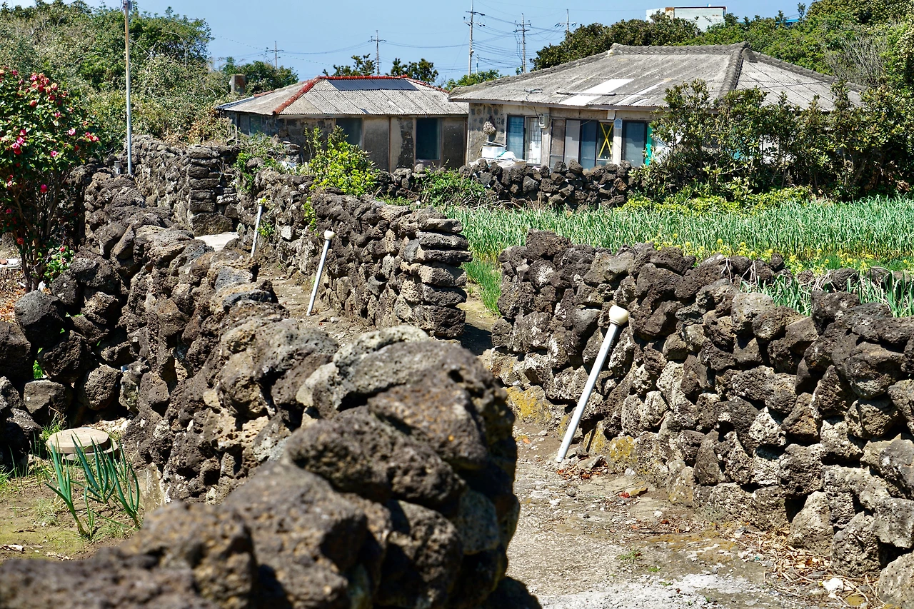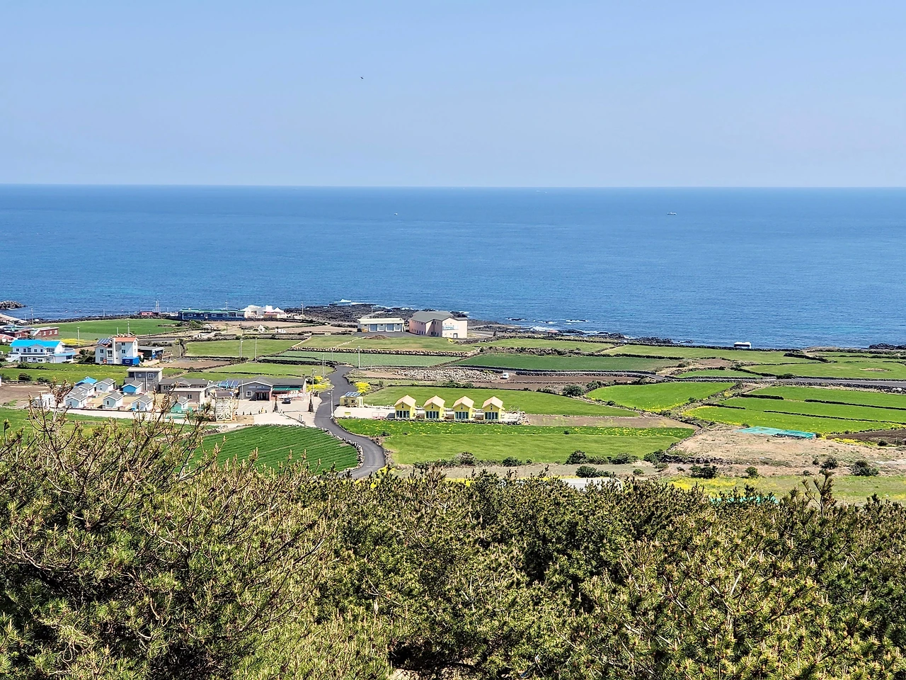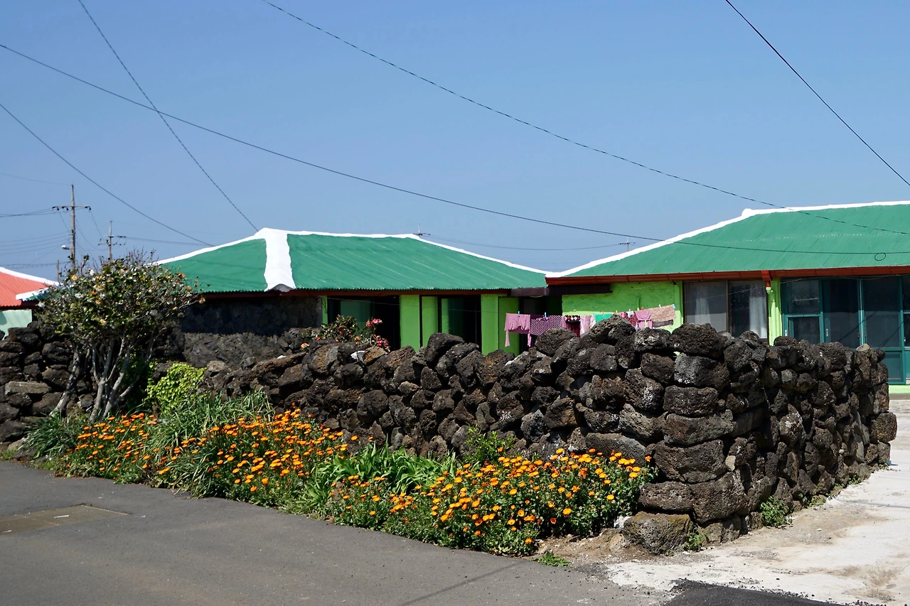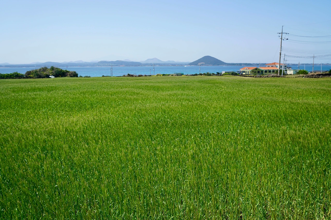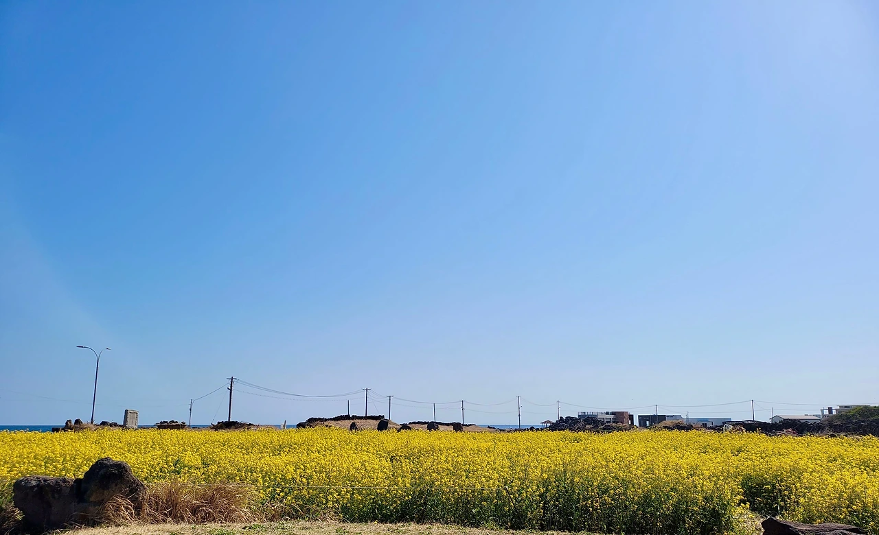 해변에서 올레길을 땨라 섬 안쪽으로 들어서면 봄보리가 돌담으로 둘러싸인 밭을 파랗게 물들이고 간간이 빈터에는 유채꽃이 흐드러지게 피어 있다. 눈을 들어 먼 곳으로 시선을 보내면 파란 수평선의 바다가 있고 지척인 눈 앞에는 봄보리의 푸르름과 유채의 샛노랑이 검은 바위 담장에 둘러 싸여 눈을 현란하게 한다.