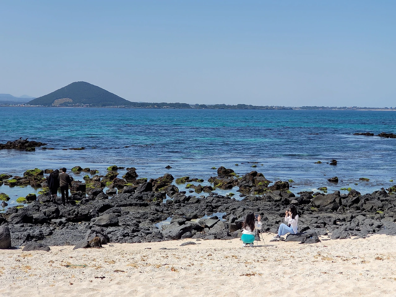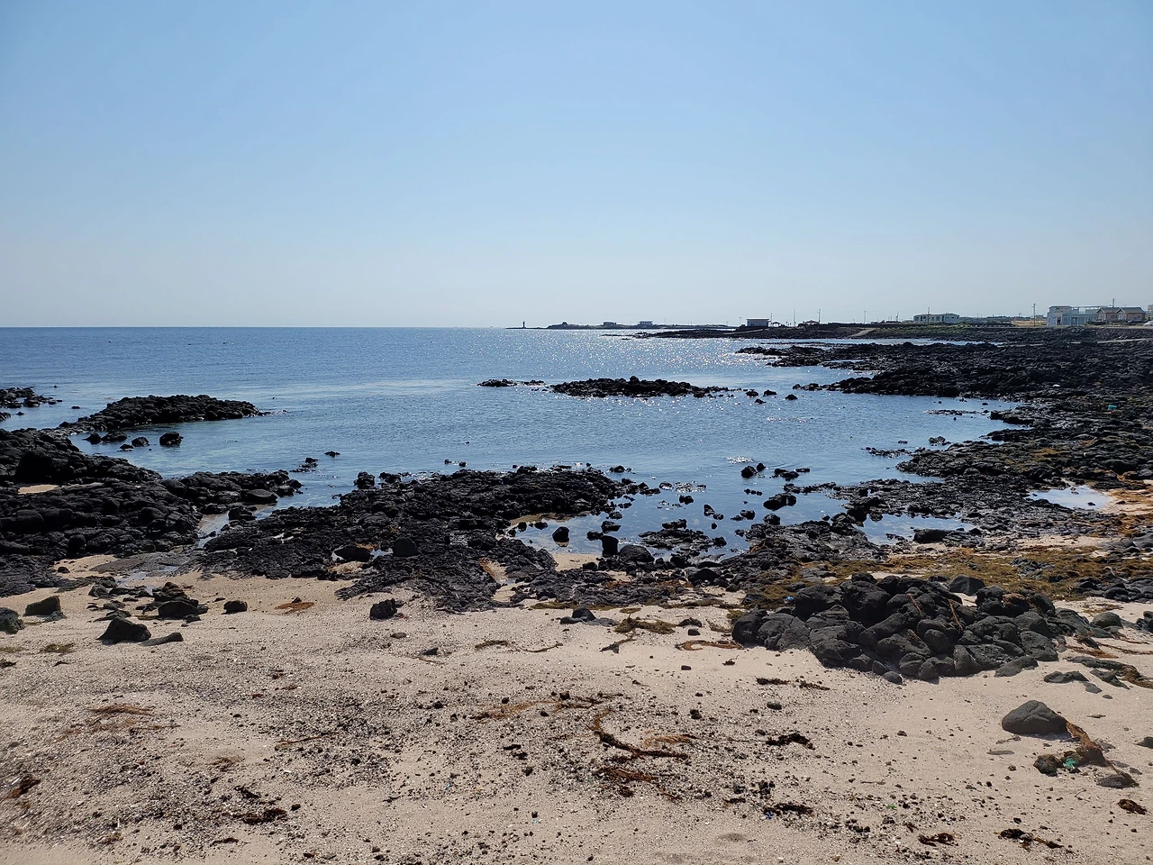 시계방향으로 섬을 한 바퀴 돌기로 하고 북쪽으로 방향을 잡았다. 섬 중의 섬 우도에서는 멀리 제주도의 오름들과 한라산이 보인다. 우도는 북쪽으로 낮은 들판이 펼쳐지고 남쪽에 우도등대가 있는 우도봉이 있다. 하우목동항에서 북쪽으로 검은 현무암으로 된 해변길을 따라 걷는데 탁 트인 바다와 파란 하늘이 가슴을 시원하게 해 준다.