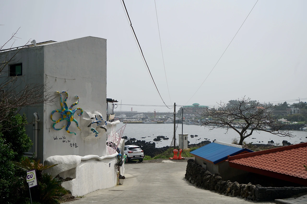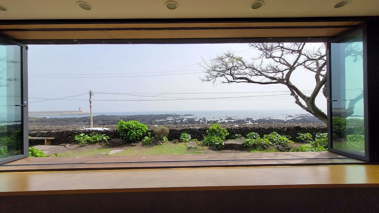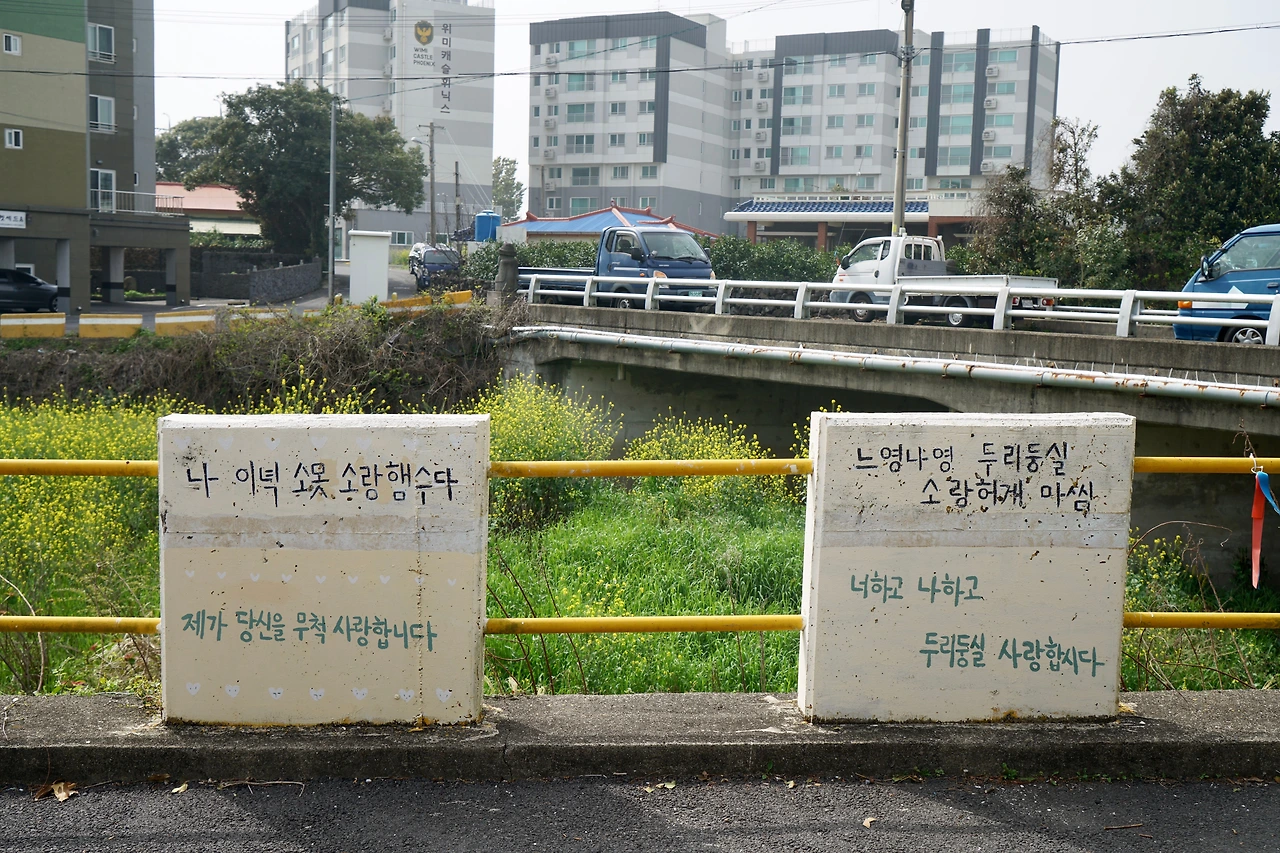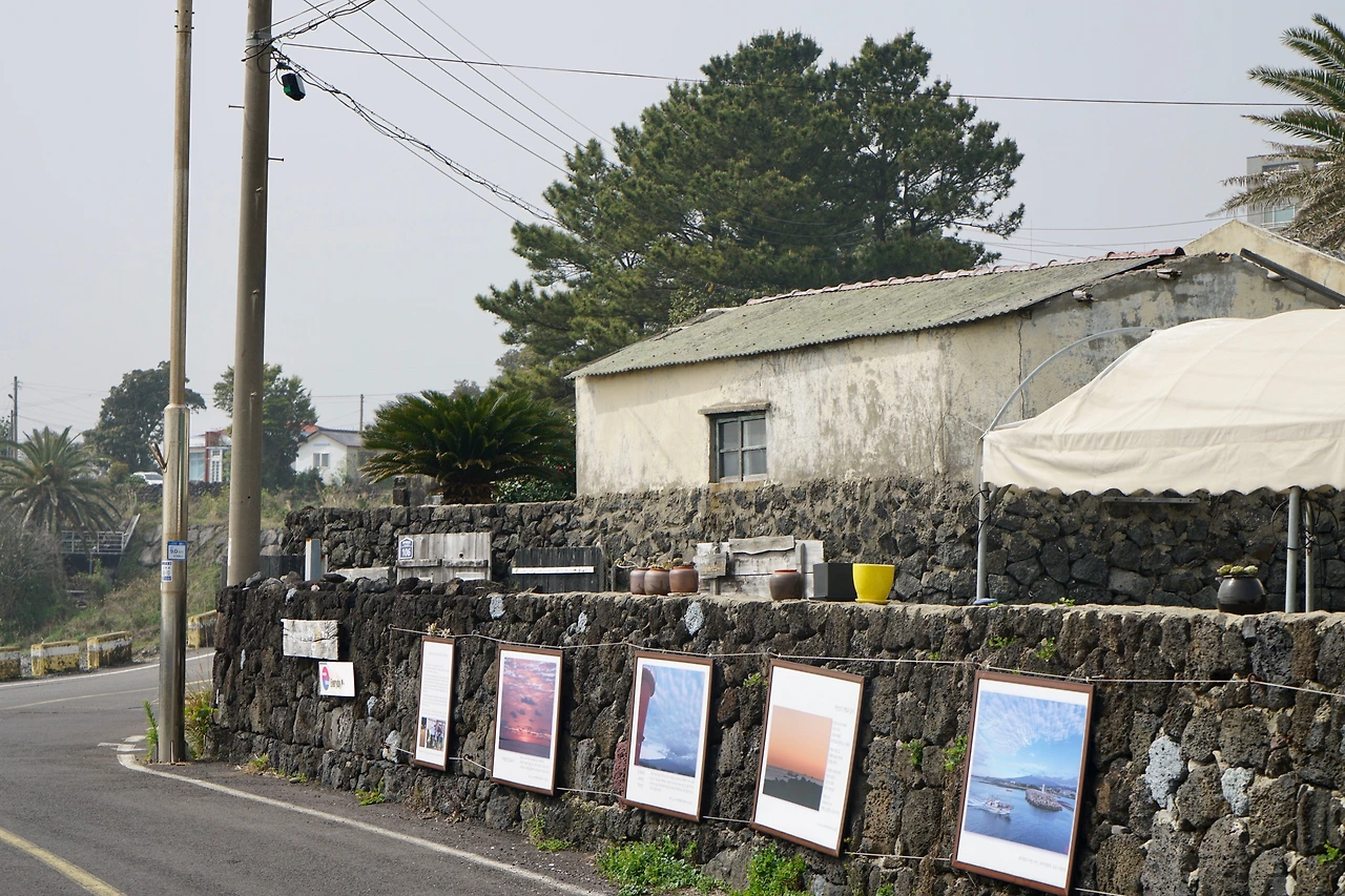 길은 위미리 어촌으로 이어진다. 예쁜 어촌이다. 어촌을 따라 해변 쪽으로 만든 야트막한 돌 둑에는 재미있는 글을 스테인리스 판에 새겨 장식해 놓았다. 돌 둑길에 붙여놓은 재미난 글들을 읽으면서 걷다가 건너편에 있는 카페에 들렀다. 카페의 탁 트인 창이 바다와 마주 앉게 해 준다.