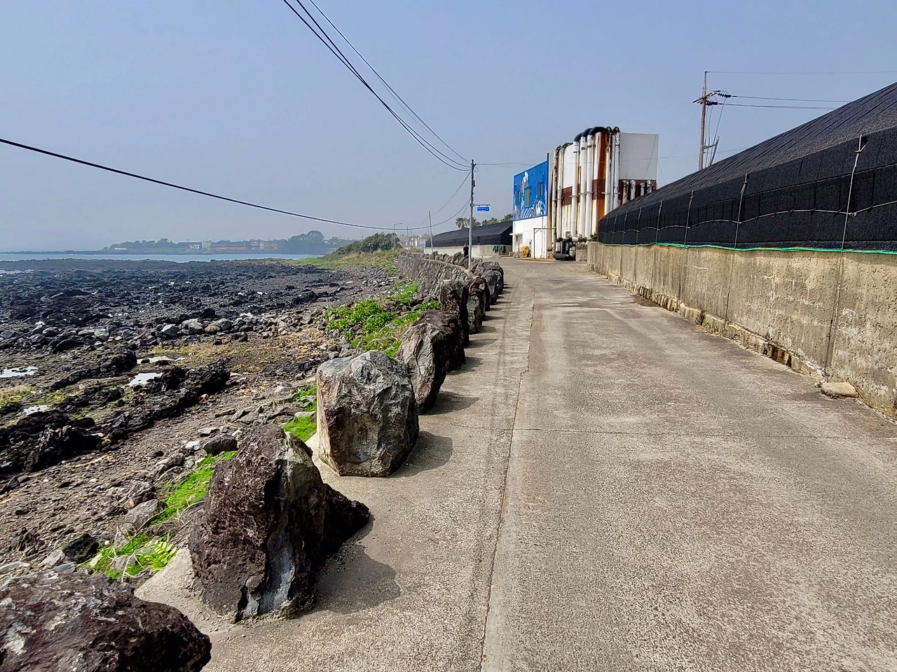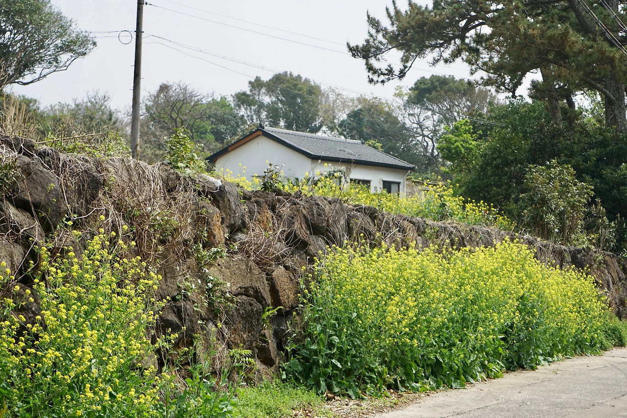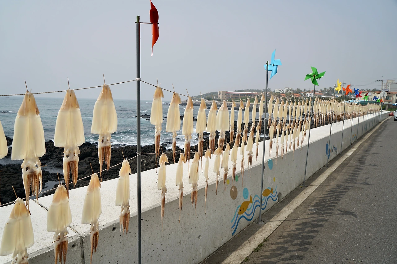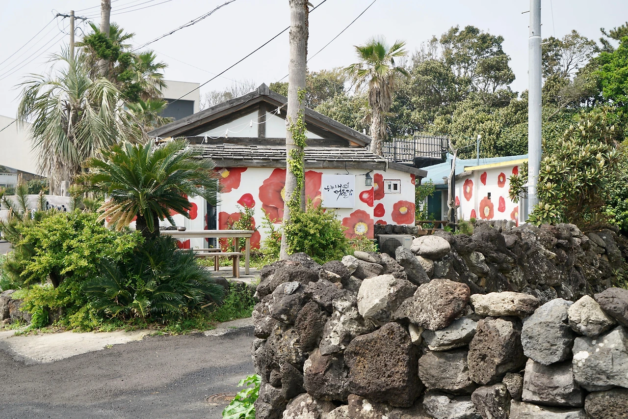 길은 위미리 어촌으로 이어진다. 예쁜 어촌이다. 어촌을 따라 해변 쪽으로 만든 야트막한 돌 둑에는 재미있는 글을 스테인리스 판에 새겨 장식해 놓았다. 돌 둑길에 붙여놓은 재미난 글들을 읽으면서 걷다가 건너편에 있는 카페에 들렀다. 카페의 탁 트인 창이 바다와 마주 앉게 해 준다.
