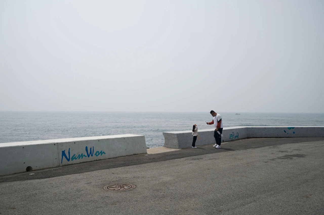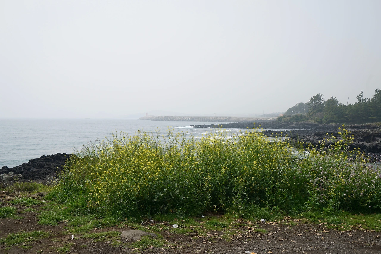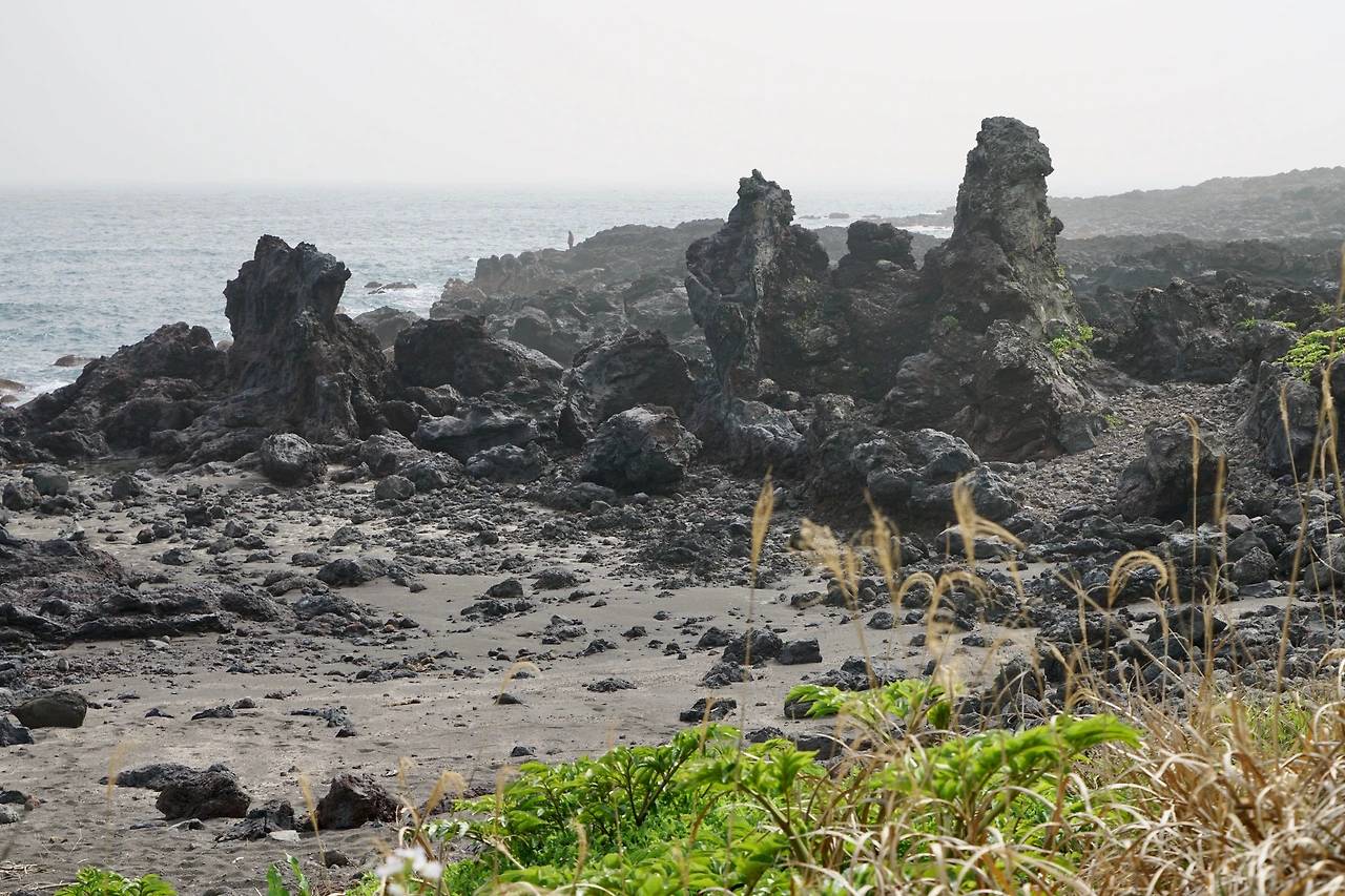 해무가 끼여 수평선이 안 보인다. 남원포구에서 걷기를 시작했다. 해변을 따라 걷는 길이 해안 숲을 드나들며 파도소리가 걸음을 따라온다. 해변 숲 사이로 바다가 드러나면 어김없이 검은 기암괴석이 나타난다. 검은 화산암이 파도가 만든 하얀 포말을 뒤집어쓰고 있다.