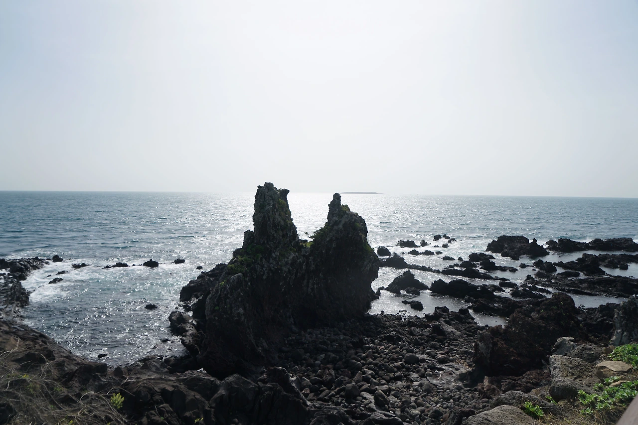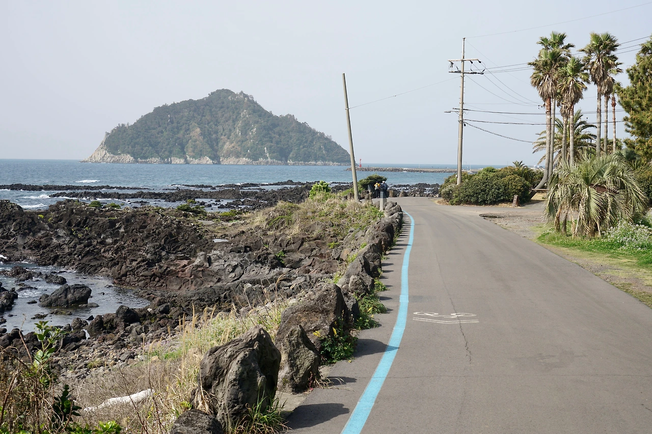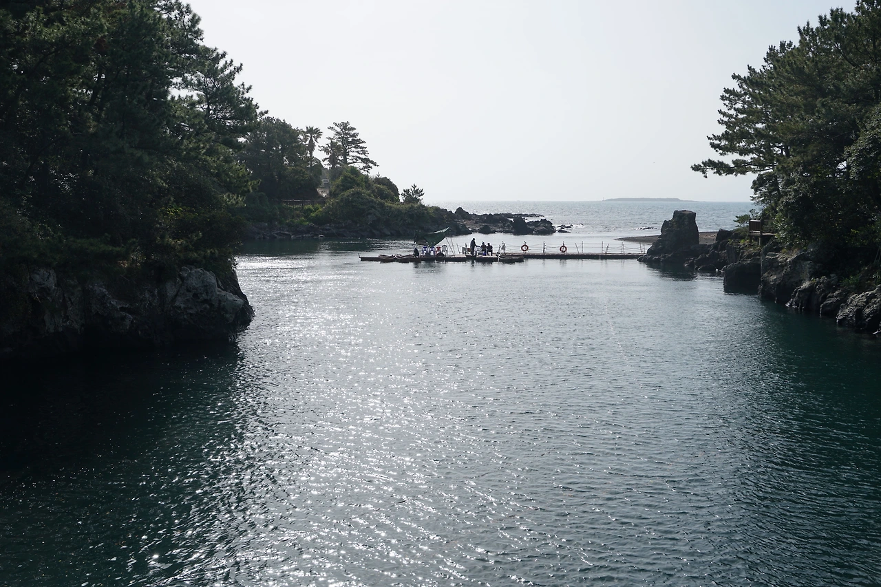 오늘의 출발점 쇠소깍을 나서니 해안길이다. 건너편에 섶섬이 있고 해변에는 검은 바위 위로 하얀 포말을 일으키며 파도가 부서진다. 쇠소깍은 효돈천의 민물과 바닷물이 합쳐지는 곳이다. 깊고 넓은 늪이 있어 전통 뗏목인 테우가 사람들을 태우고 오르내린다.
