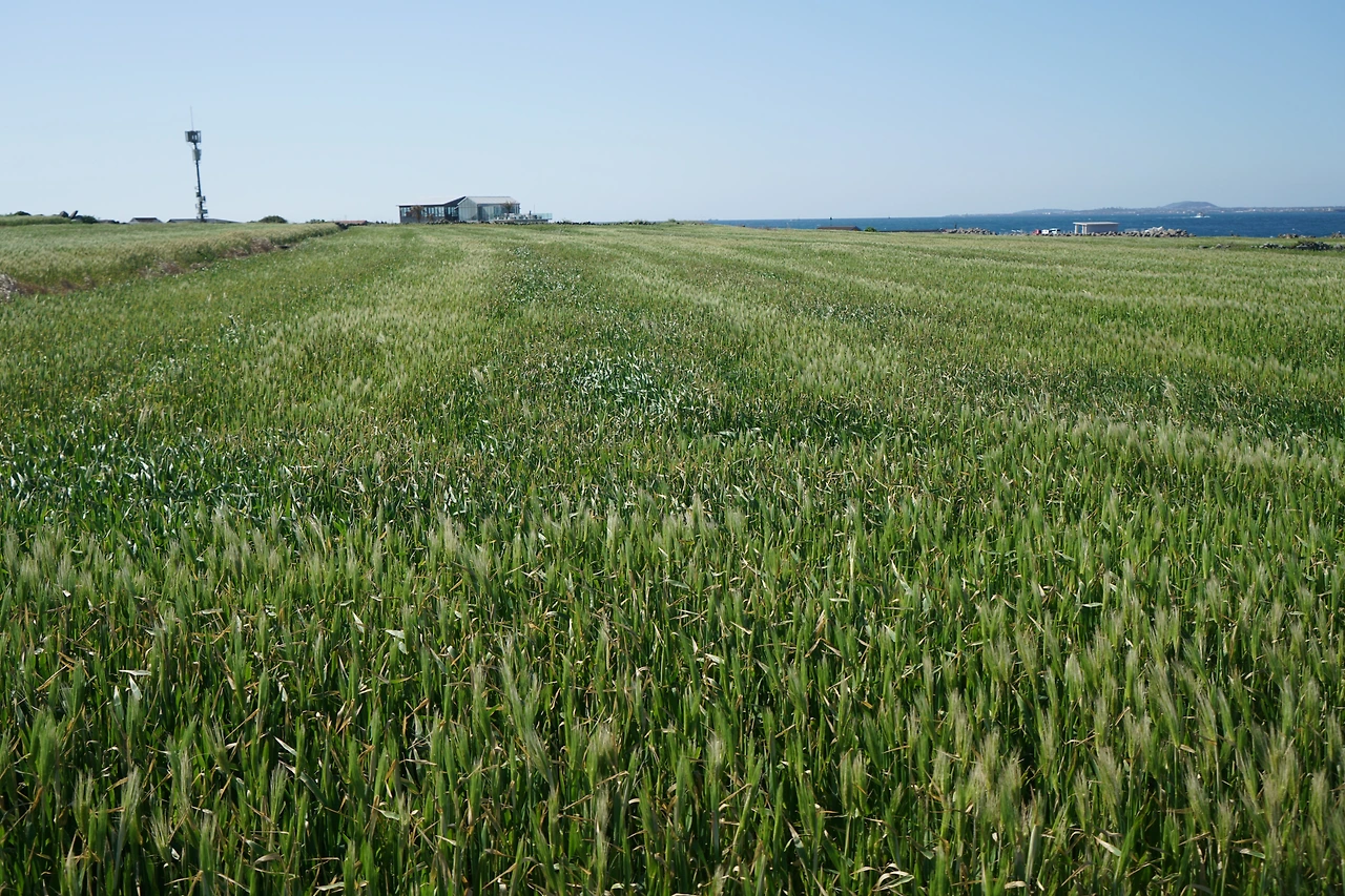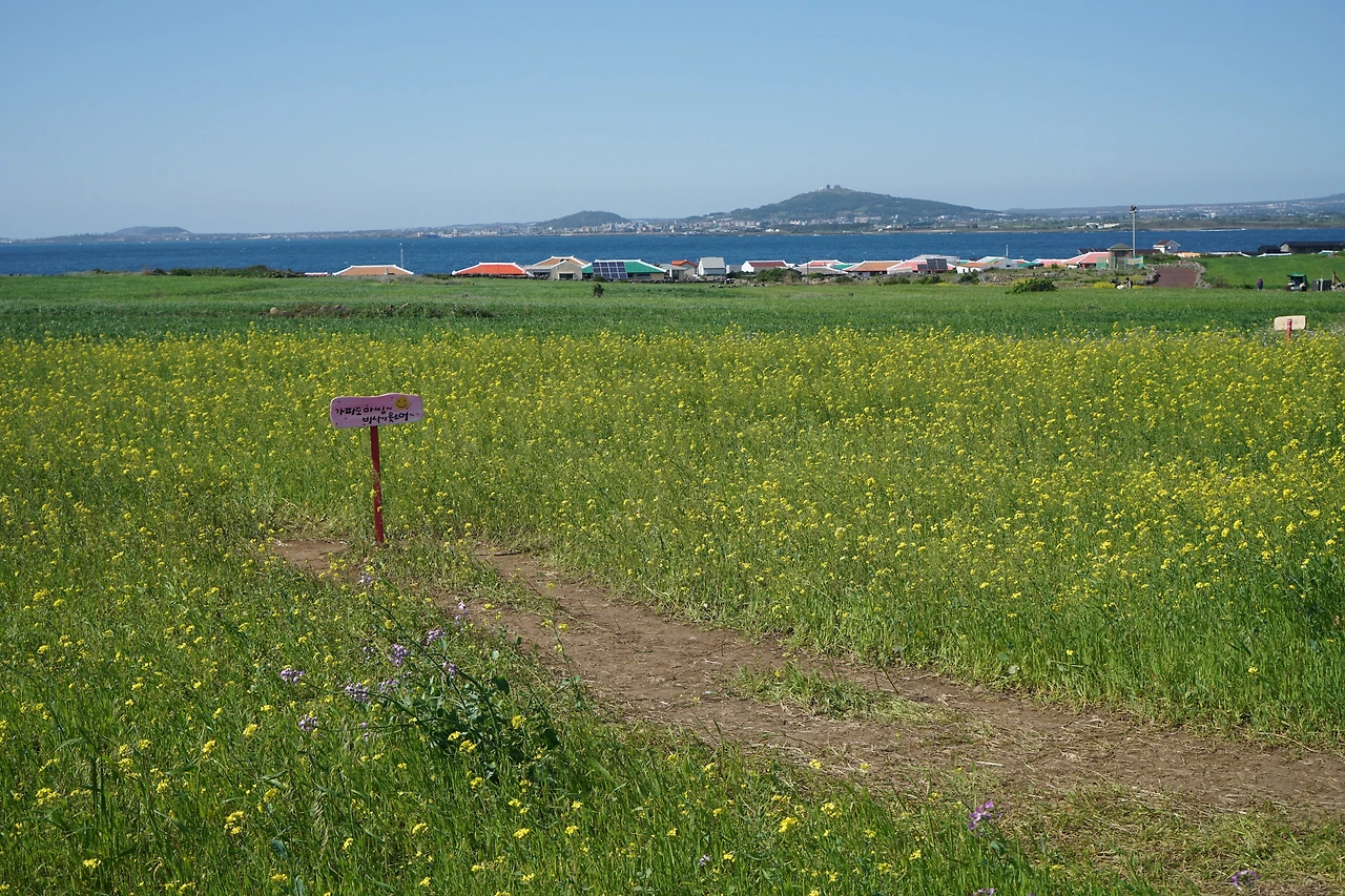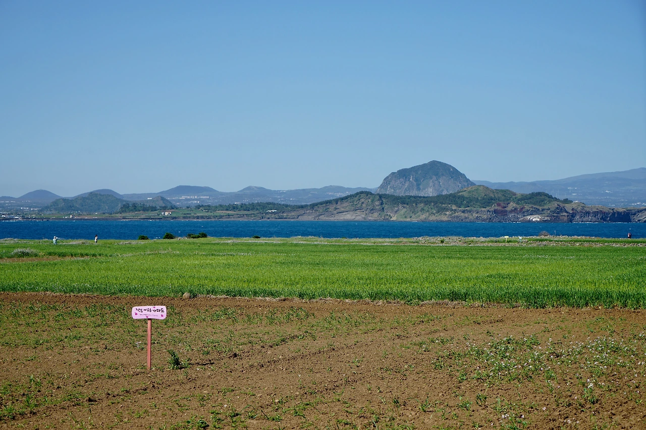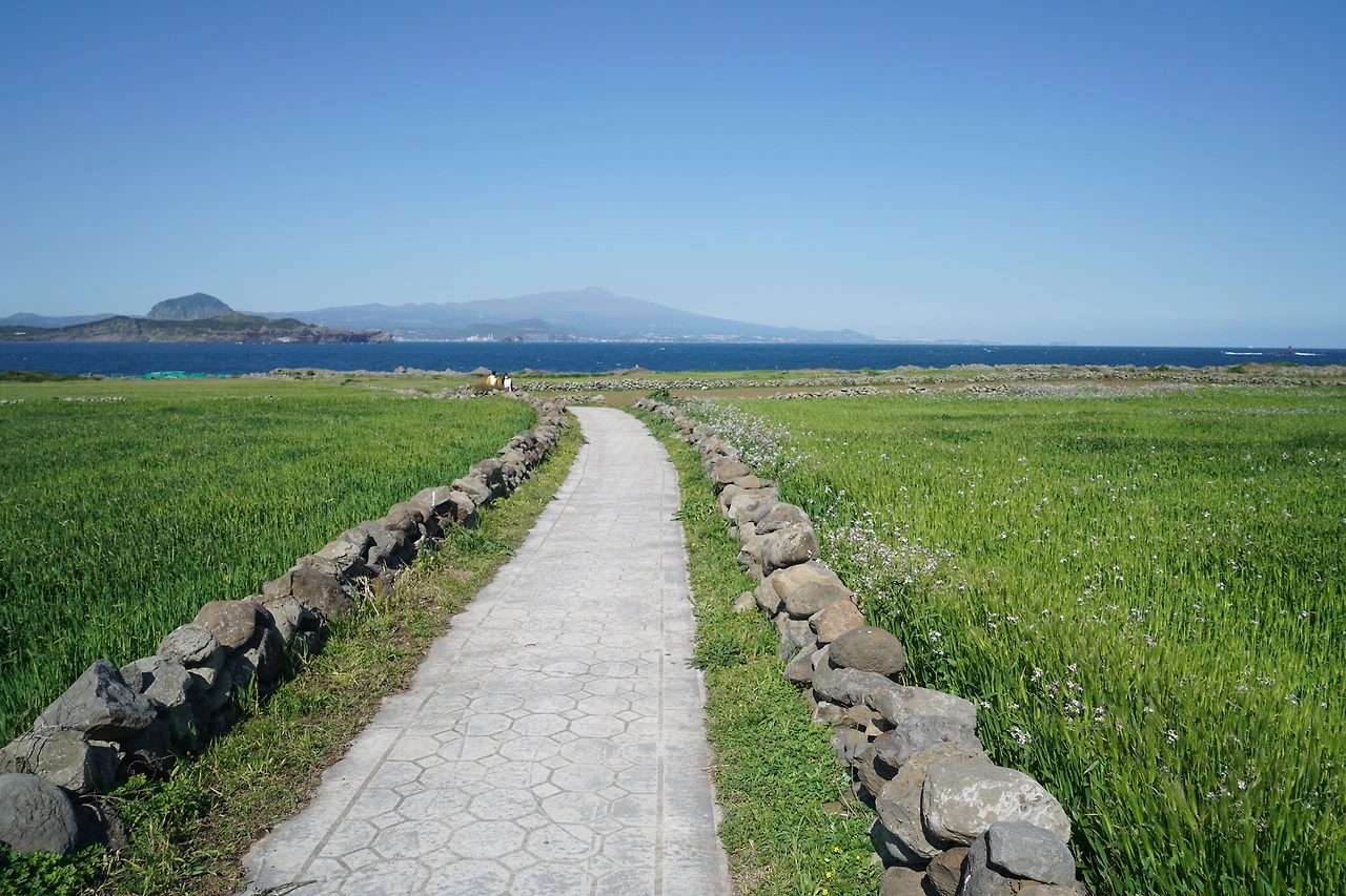 보말칼국수로 점심을 먹고 시계 반대방향으로 해안을 따라 섬 일주를 나섰다. 해안을 따라 반대편까지 갔다가 섬 중앙으로 들어와서 8자를 그리며 반대편 해안을 따라 다시 섬 끝까지 갔다. 거리는 4km 정도, 천천히 걸어도 한 시간 조금 더 걸린다. 섬 안에는 청보리밭이 많다. 파란 보리밭 너머로 한라산과 삼방산이 그림같이 보인다. 파란 수평선과도 잘 어울린다. 섬 일주를 마친 후 선착장 근처에서 커피를 마시고 다시 페리에 올랐다. 모슬포항에서 10구간 종점인 하모 체육공원까지 더 걸어 오늘은 2개 구간 걷기를 마무리했다.
