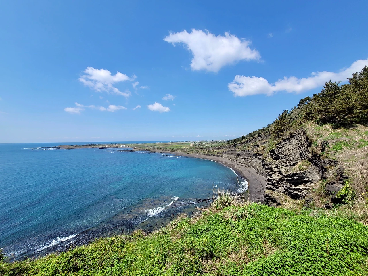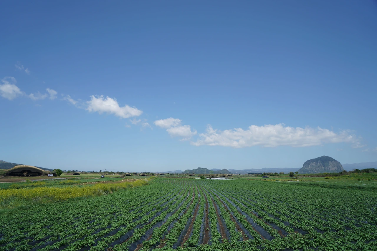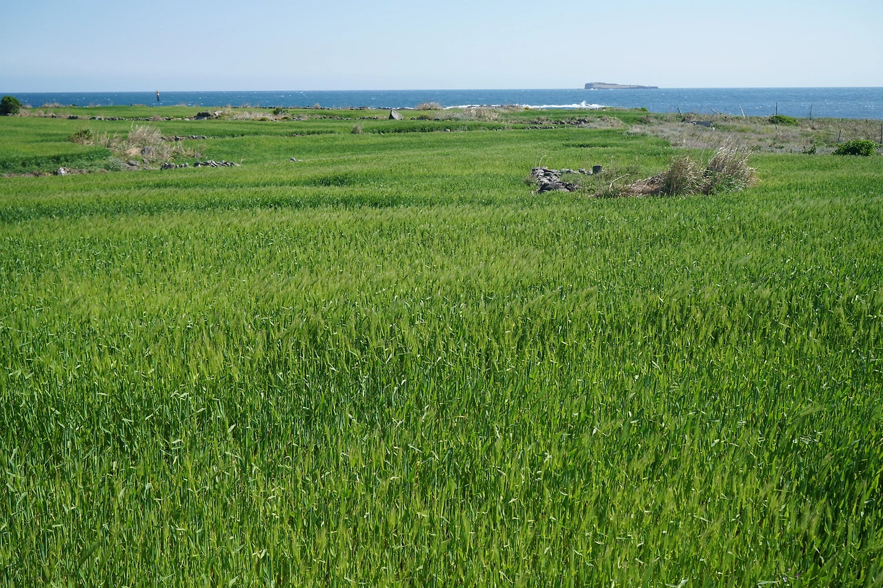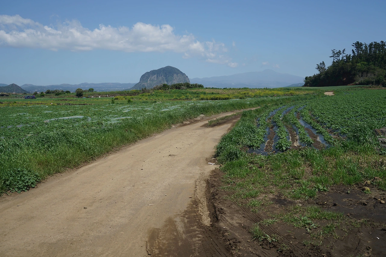 보말칼국수로 점심을 먹고 시계 반대방향으로 해안을 따라 섬 일주를 나섰다. 해안을 따라 반대편까지 갔다가 섬 중앙으로 들어와서 8자를 그리며 반대편 해안을 따라 다시 섬 끝까지 갔다. 거리는 4km 정도, 천천히 걸어도 한 시간 조금 더 걸린다. 섬 안에는 청보리밭이 많다. 파란 보리밭 너머로 한라산과 삼방산이 그림같이 보인다. 파란 수평선과도 잘 어울린다. 섬 일주를 마친 후 선착장 근처에서 커피를 마시고 다시 페리에 올랐다. 모슬포항에서 10구간 종점인 하모 체육공원까지 더 걸어 오늘은 2개 구간 걷기를 마무리했다.