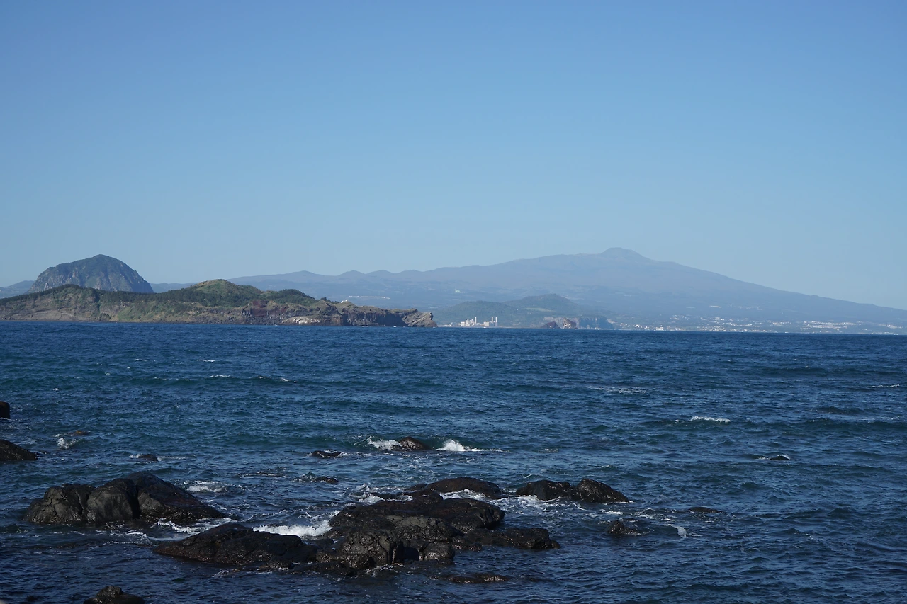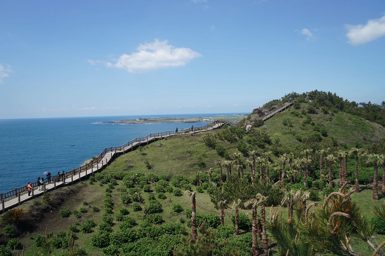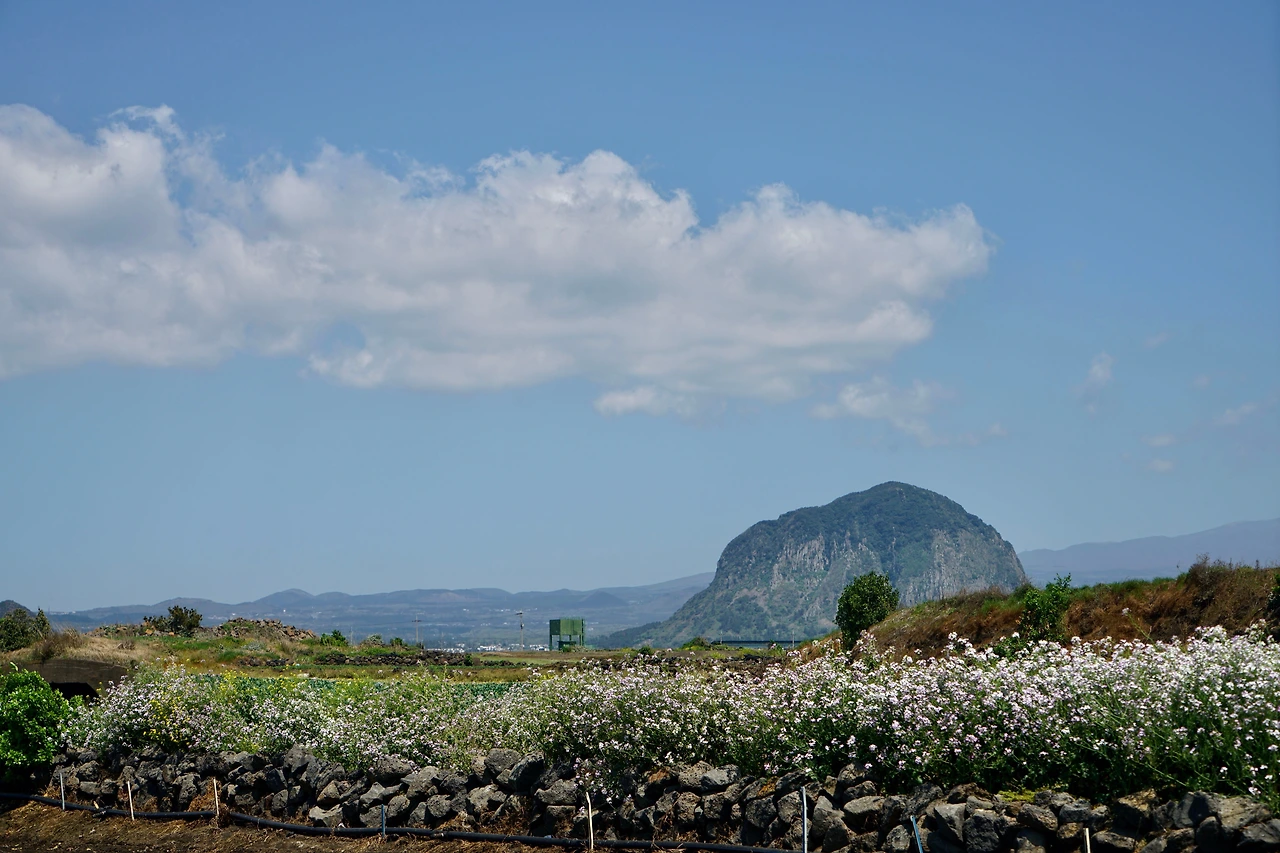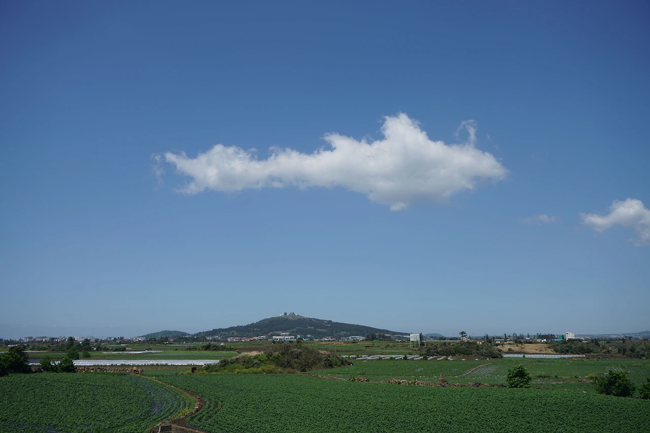산방산 밑을 지나면 나무 데크 계단을 올라 전망대에 선다. 좌측으로 멀리 박수기정과 월라봉이 보이고 우측으로 송악산이 보인다. 바다 위에는 형제섬이 지척에 있고 가파도와 마라도도 멀리 시야에 들어온다. 삼방산은 육중한 모습으로 우뚝 솟아있다. 날씨가 좋아 수평선이 칼로 벤 듯 하늘과 경계선이 뚜렷하여 바라보는 마음이 시원하다.