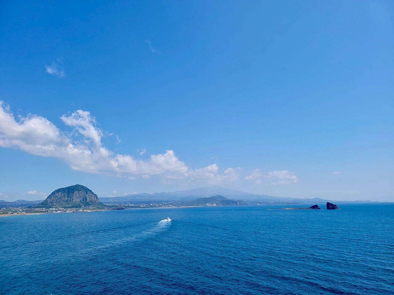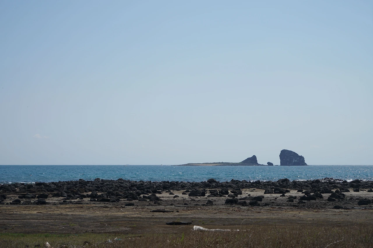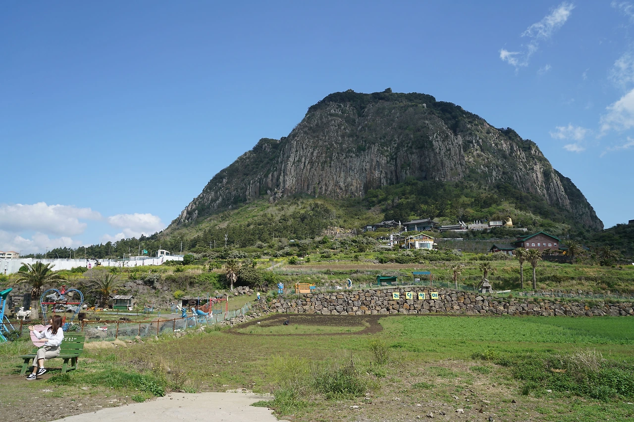산방산 밑을 지나면 나무 데크 계단을 올라 전망대에 선다. 좌측으로 멀리 박수기정과 월라봉이 보이고 우측으로 송악산이 보인다. 바다 위에는 형제섬이 지척에 있고 가파도와 마라도도 멀리 시야에 들어온다. 삼방산은 육중한 모습으로 우뚝 솟아있다. 날씨가 좋아 수평선이 칼로 벤 듯 하늘과 경계선이 뚜렷하여 바라보는 마음이 시원하다.