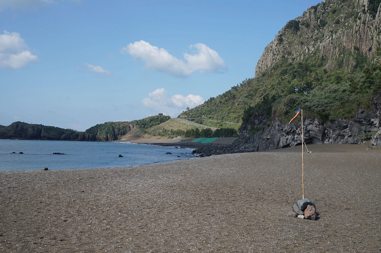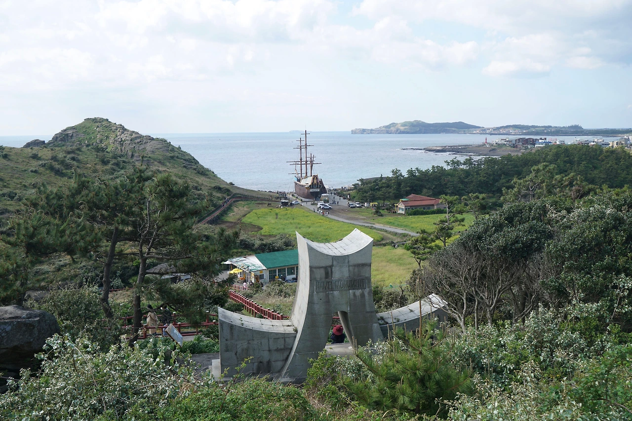 전망대를 내려서면 하멜 기념탑이 있고 여기서부터는 용머리해안이다. 바위가 용이 바다로 들어가는 듯한 모습이라고 해서 붙여진 이름이다. 용머리 해안을 지나면 사계포구가 나타나고 사계포구에서 송악산 까지는 차도를 따라 걷지만 바다경치가 좋아 지루하지 않고 가벼운 마음으로 산책 나서기에 좋은 길이다. 날씨가 좋아 해변을 걷는 사람이 많다.